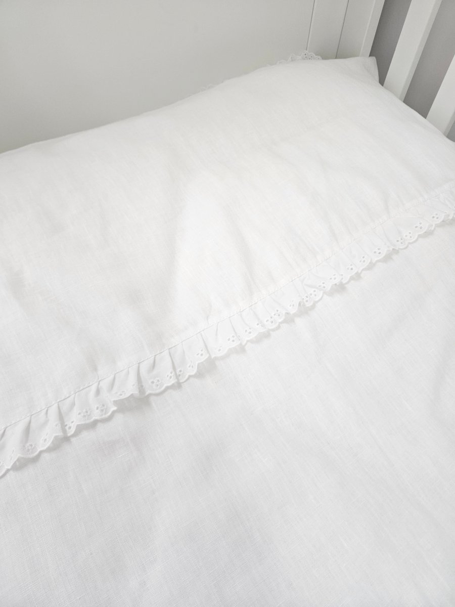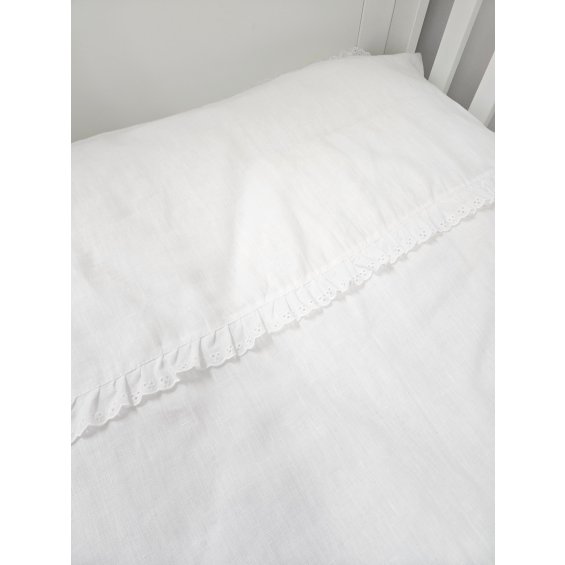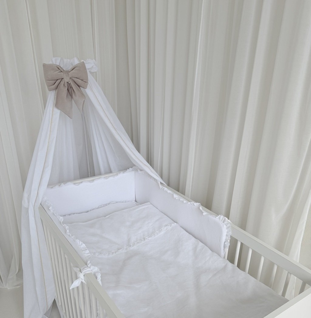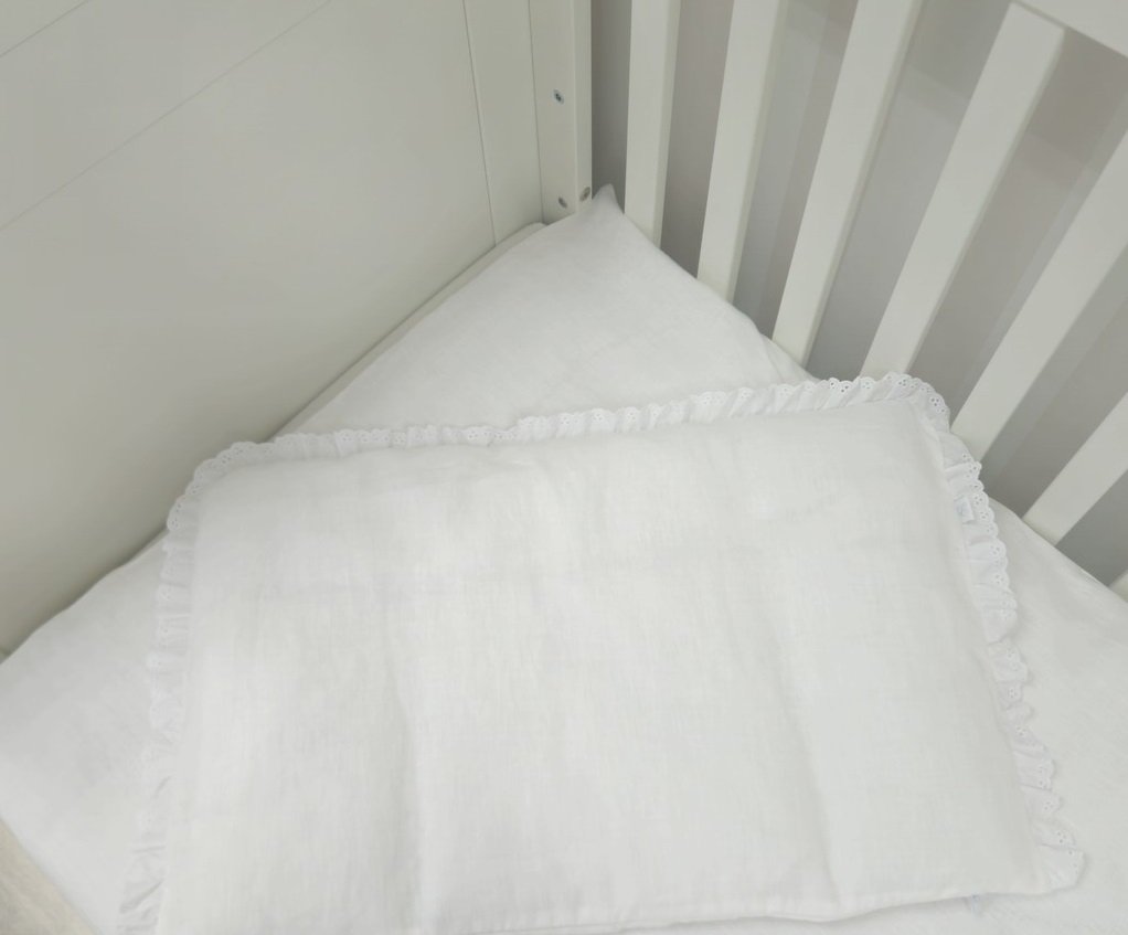 Delikatna pościel niemowlęca wykonana z wysokiej jakości, naturalnego białego lnu, zapewniająca komfort i przewiewność podczas snu maluszka. Subtelna falbanka richelieu dodaje całości elegancji i lekkiego, romantycznego charakteru, czyniąc pościel idealnym wyborem do przytulnego i stylowego dziecięcego łóżeczka.