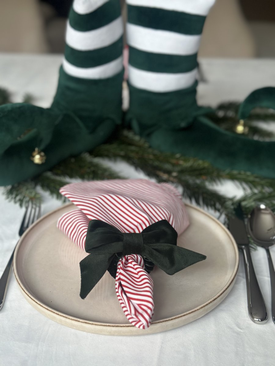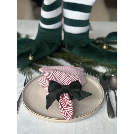 But elfa to piękna dekoracja świąteczna wykonana z zielonego i białego weluru, ozdobiona złotym dzwoneczkiem. Można go postawić w oknie, na komodzie lub przy choince.