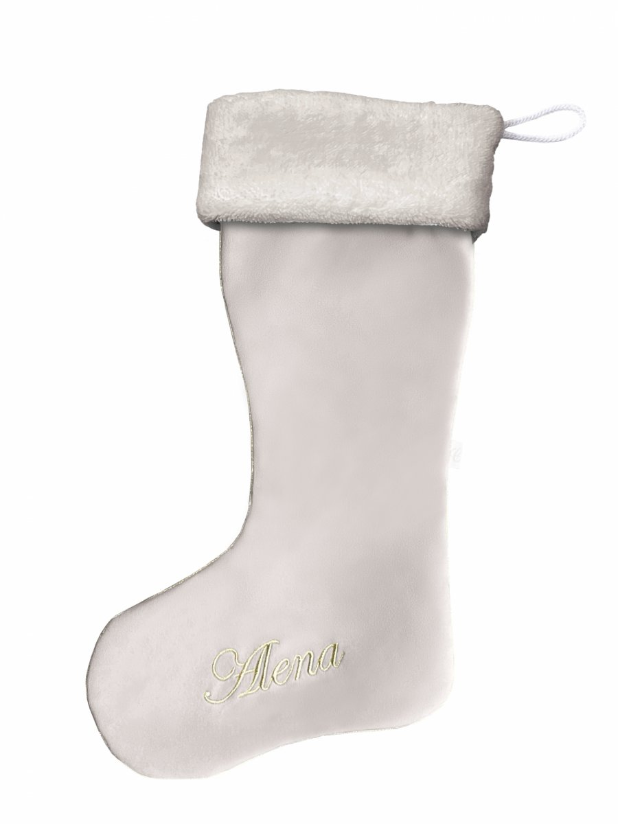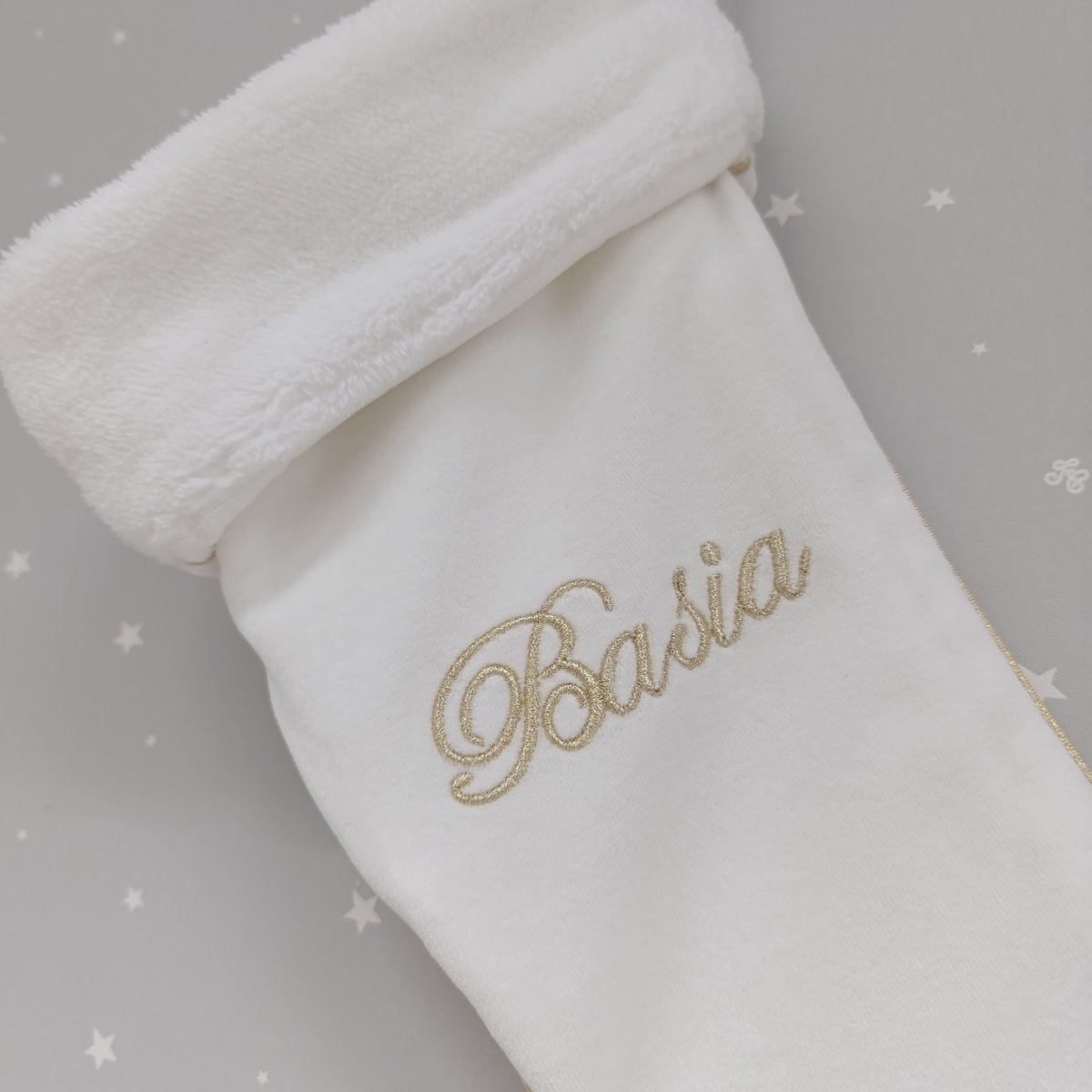 Świąteczna skarpeta na prezenty z możliwością personalizacji. Piękna dekoracja świąteczna a także świetny pomysł na prezent mikołajkowy i gwiazdkowy. Skarpeta wykonana z beżowego weluru, wykończona beżowym pluszowym futerkiem i złotą kedrą. Cena zawiera personalizację, haft wykonujemy złotą nicią.
