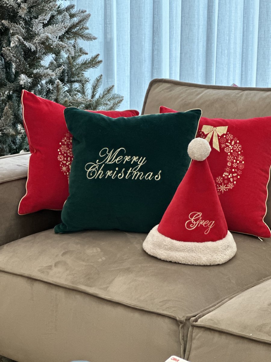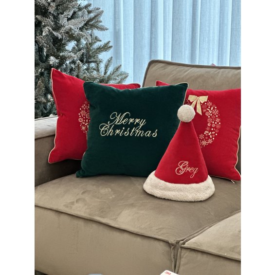 Świąteczna poduszka wykonana z mięciutkiego weluru w kolorze zielonym. Ozdobiona złotym haftem Merry Christmas, wykończona złotą kedrą. To piękna dekoracja, która wprowadzi do wnętrza świąteczny nastrój.