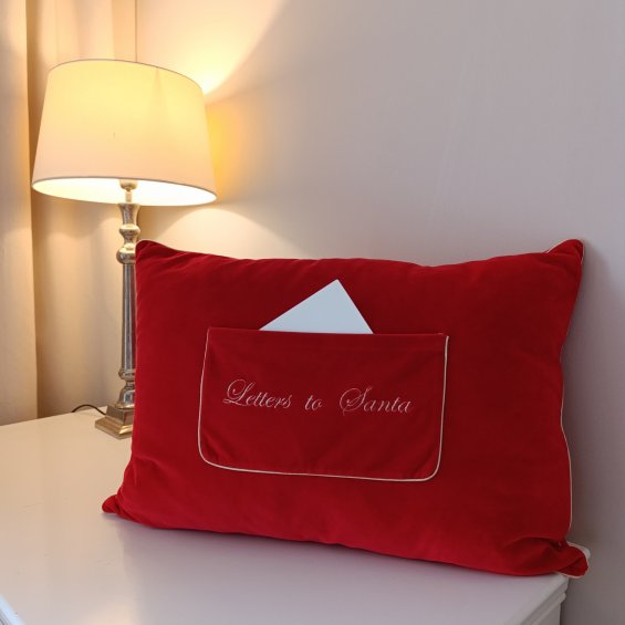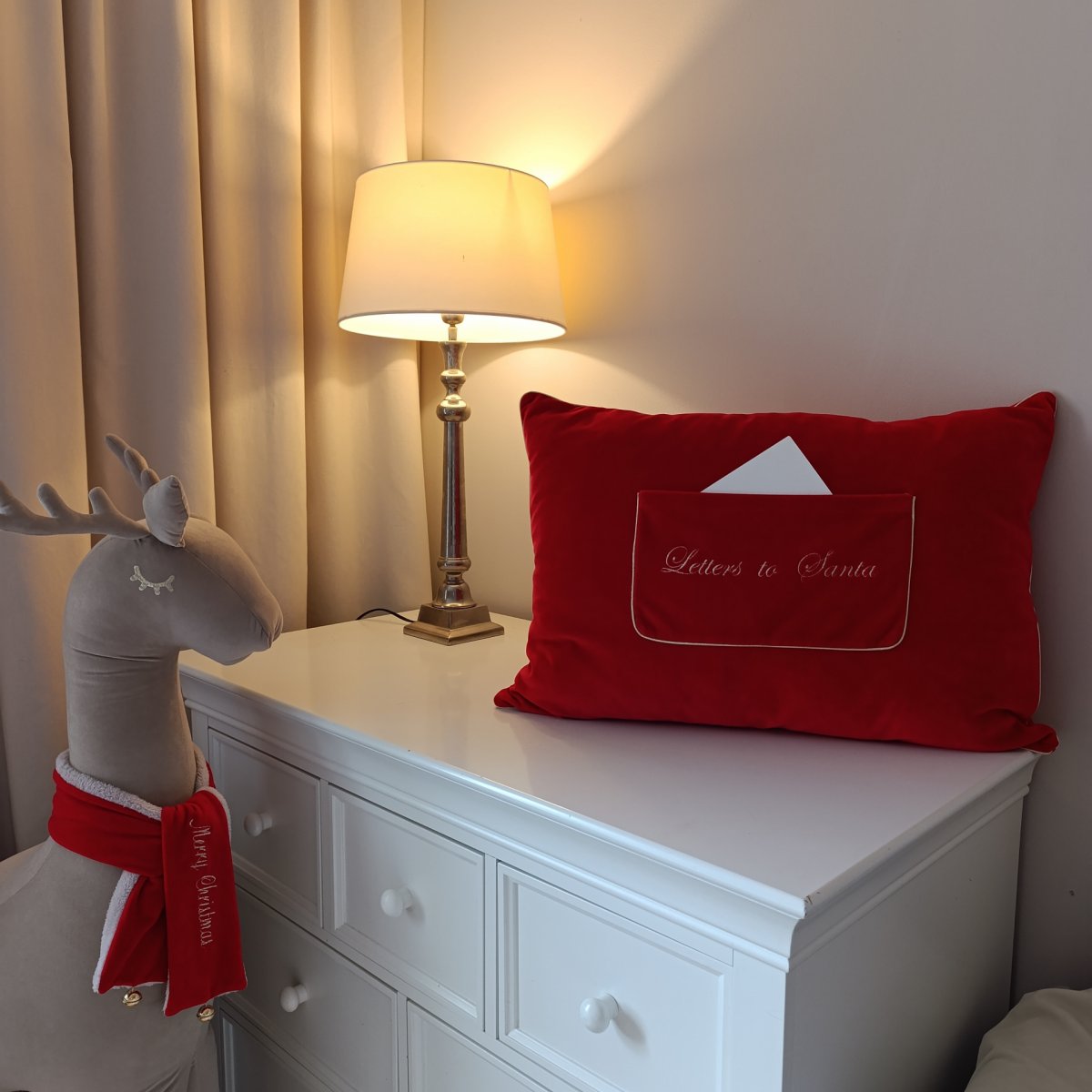 Świąteczna poduszka wykonana z mięciutkiego weluru w kolorze czerwonym. Ozdobiona kieszonką złotym haftem Letters to Santa, wykończona złotą kedrą. To piękna dekoracja, która wprowadzi do wnętrza świąteczny nastrój.