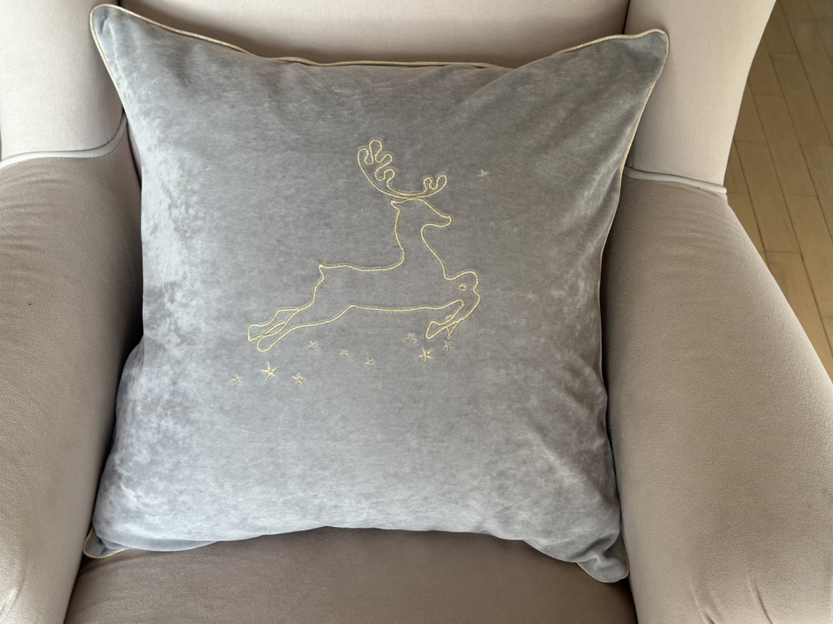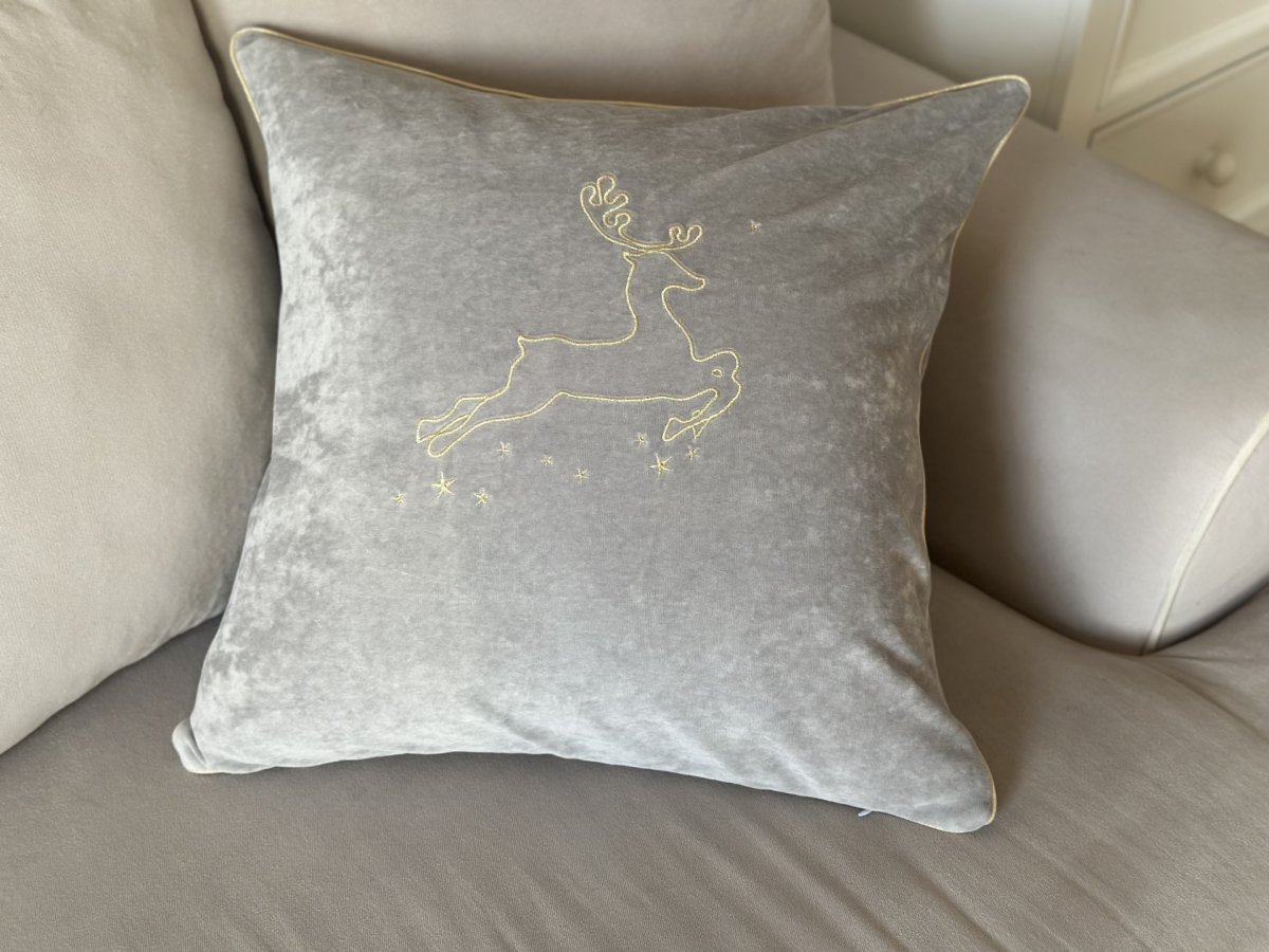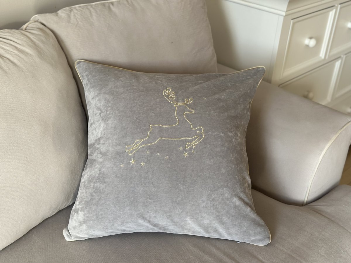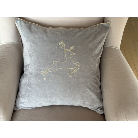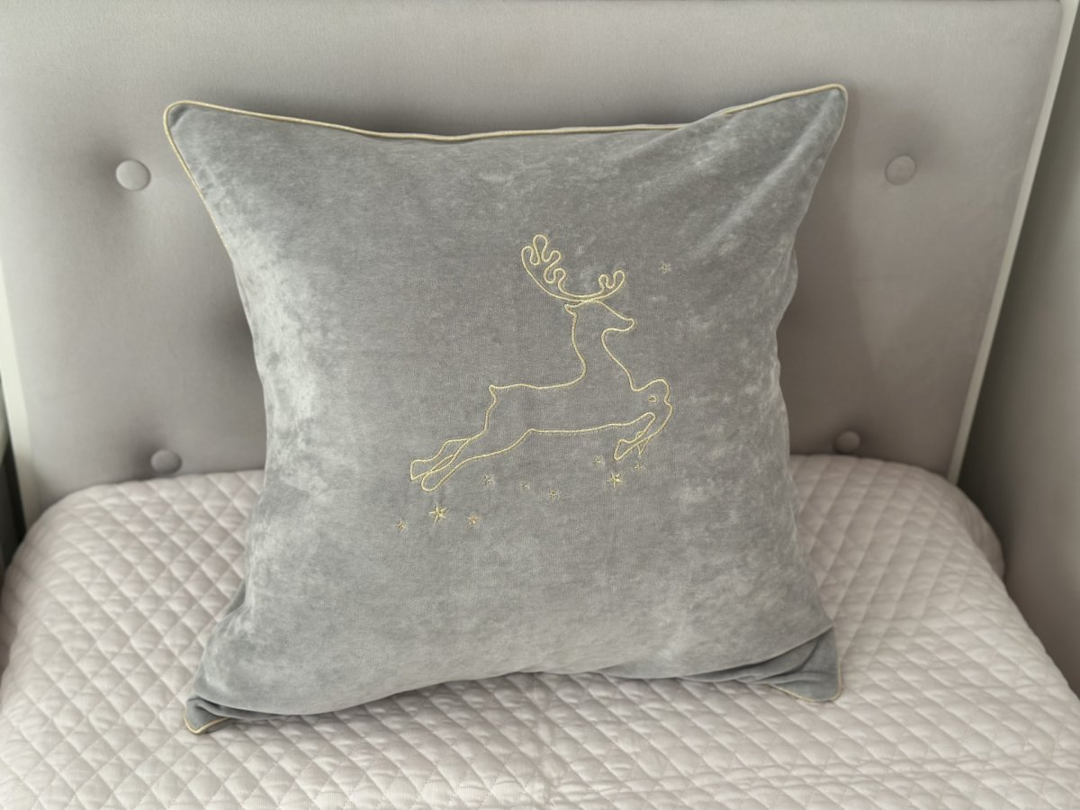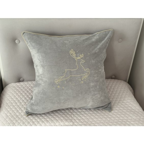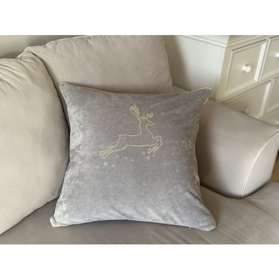 Świąteczna poduszka wykonana z mięciutkiego weluru. Ozdobiona złotym haftem z motywem renifera, wykończona złotą kedrą. To piękna dekoracja, która wprowadzi do wnętrza świąteczny nastrój.