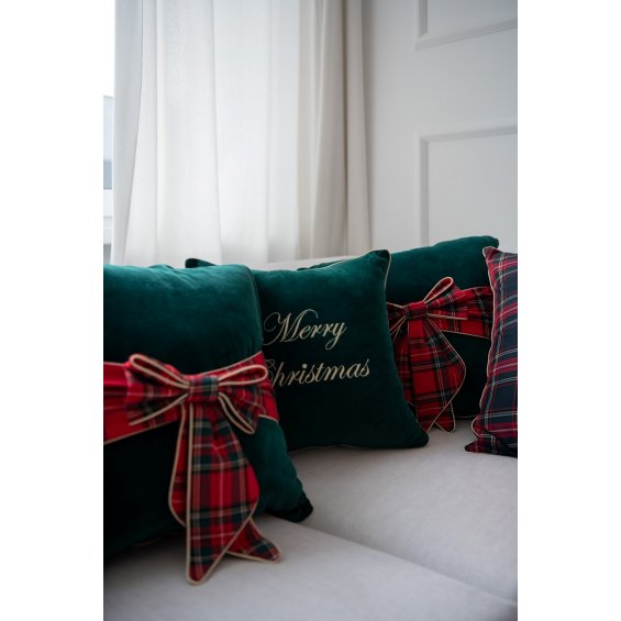 Stylowa zielona poduszka ozdobiona kokardą w szkocką kratę to elegancki dodatek, który nada wnętrzu przytulnego, klasycznego charakteru. Połączenie głębokiej zieleni z tradycyjnym wzorem tworzy ponadczasowy efekt, idealny do aranżacji świątecznych i codziennych. Doskonale prezentuje się na sofie, fotelu lub łóżku, stanowiąc subtelny, a jednocześnie wyrazisty akcent dekoracyjny.
