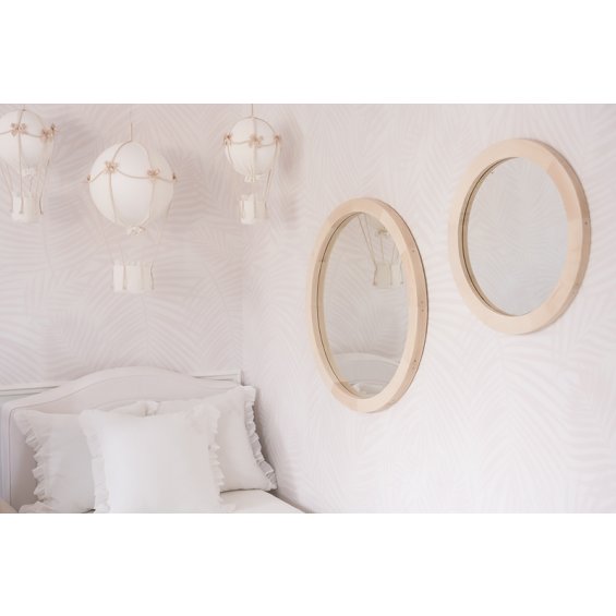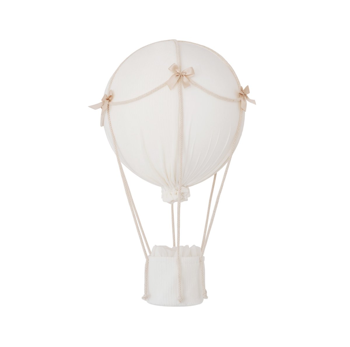 Dekoracyjny balon do pokoju dziecięcego w kolorze kości słoniowej. Balon wykonany jest z weluru o różnych fakturach - prążkowanej i gładkiej. Koszyczek został ozdobiony transparentną falbanką, a sznurki uroczymi beżowymi kokardkami. Balon posiada pętelkę, za pomocą której można go z łatwością powiesić.