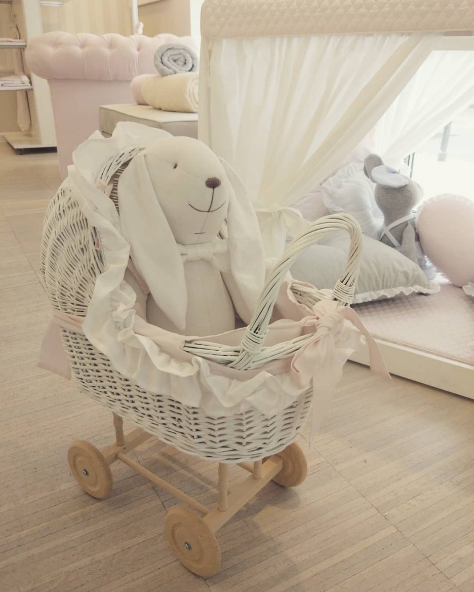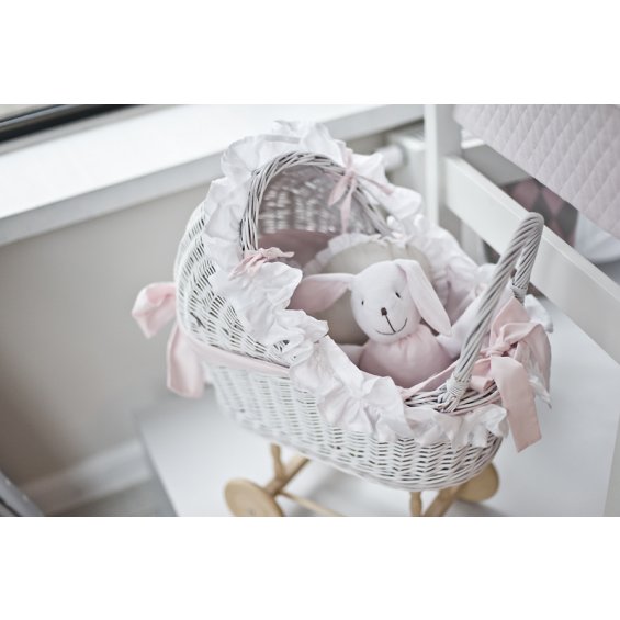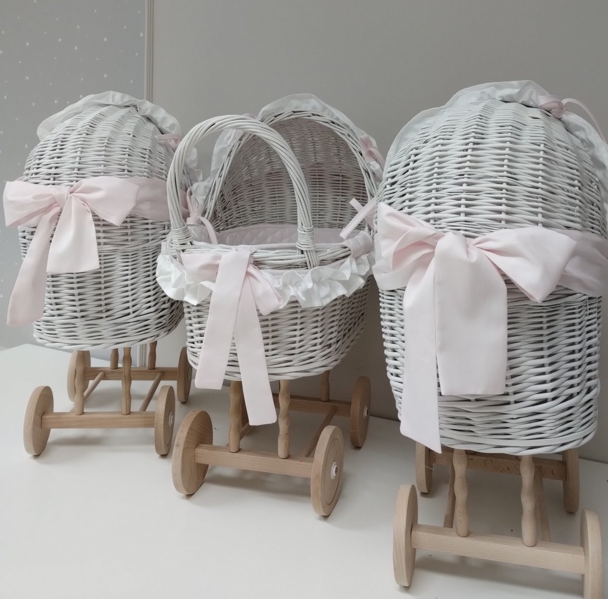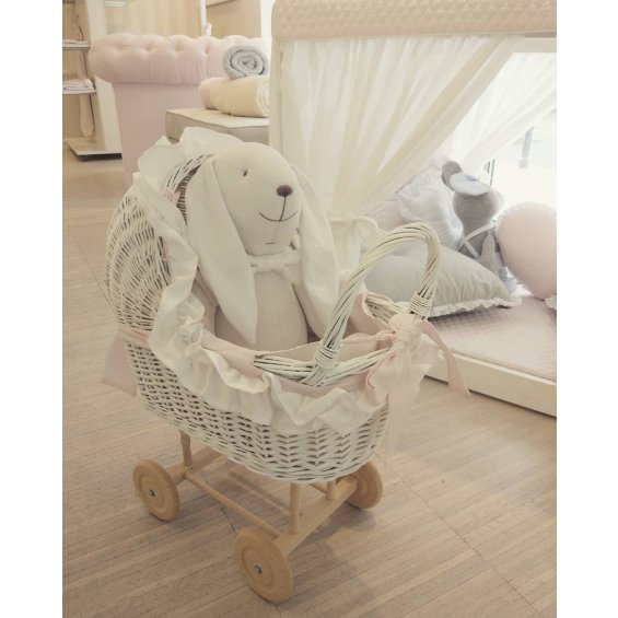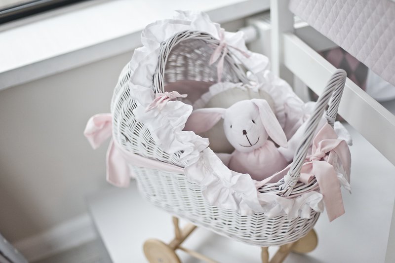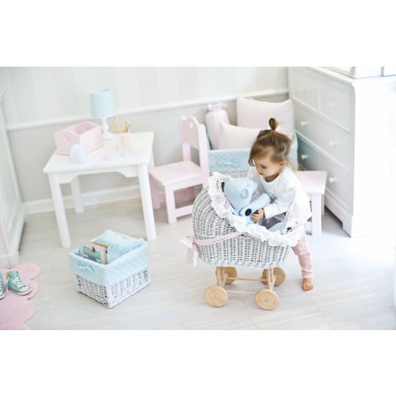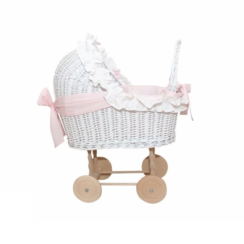 Śliczny wiklinowy wózeczek z biało-pudrowymi dodatkami. Ręcznie wyplatany z najwyższej jakości polskiej wikliny, ozdobiony białą bawełnianą falbanką i pudrowym wnętrzem. Doskonale sprawdzi się jako dekoracja w pokoju Twojej córeczki. Jest też doskonałym pomysłem na prezent. Wózeczek posiada ruchome kółka.