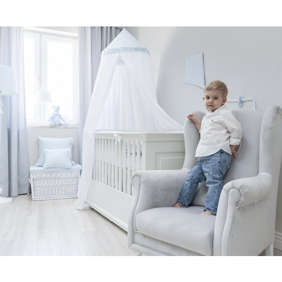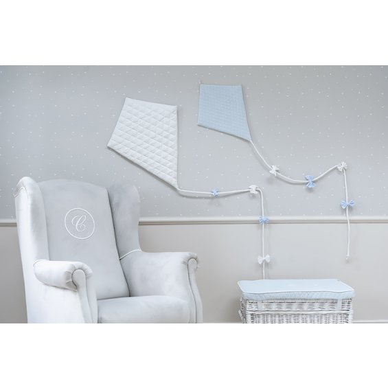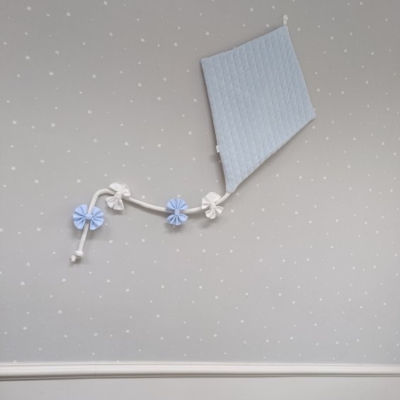Piękny, ręcznie robiony latawiec dekoracyjny wykonany z pikowanego weluru w kolorze błękitnym. Sznurek latawca jest ozdobiony uroczymi kokardkami w kolorach błękitnym oraz białym. Latawiec stanowi piękną dekorację zarówno w pokoiku niemowlęcym, jak i starszego dziecka.