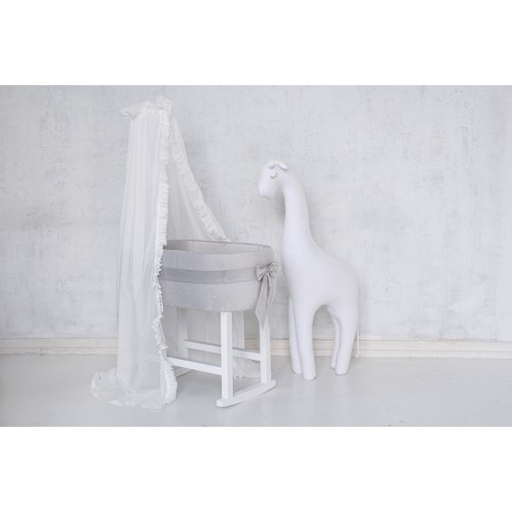 Dekoracyjna welurowa kokarda do ozdobienia kołyski. Kokarda szara pasuje do kołyski szarej, pudrowej oraz błękitnej.