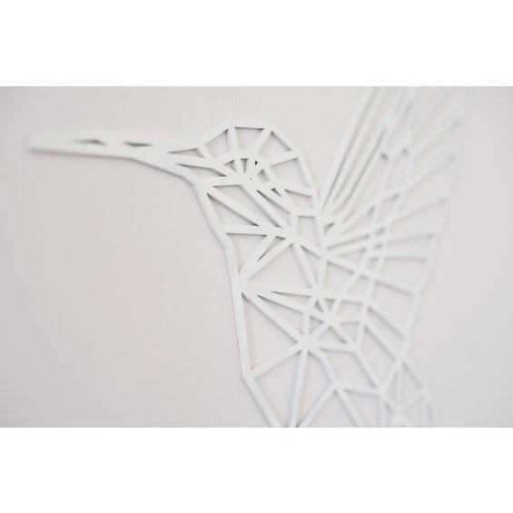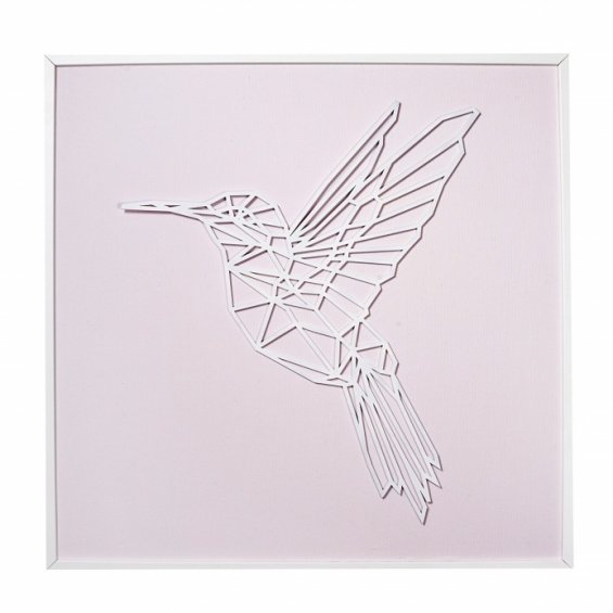 Elegancki obraz w kolorze pudrowym z motywem kolibra wykonanym z drewna. Osadzony w prostej, białej ramie będzie stanowił piękną dekorację w pokoju dziecięcym.