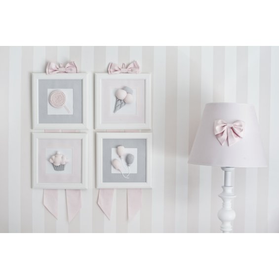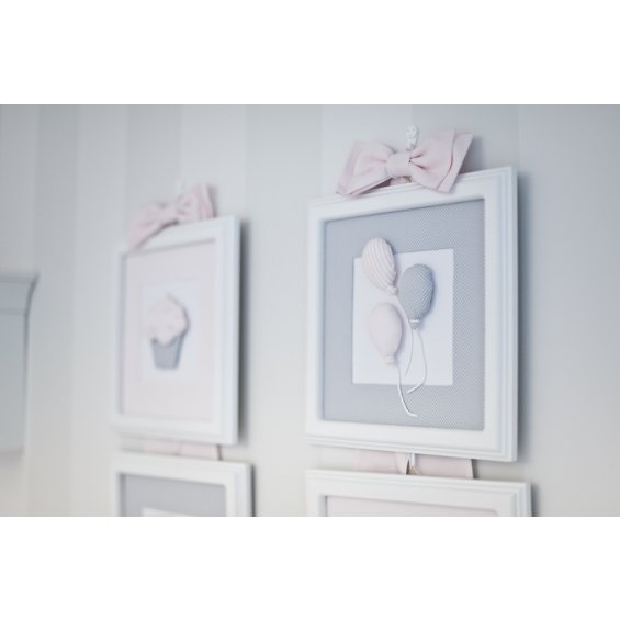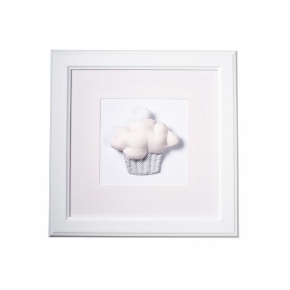 Uroczy trójwymiarowy muffinek w odcieniach pudrowym i szarym. Wnętrze obrazków w całości wykonane z tkaniny. Passe -partout wykonany z materiału pudrowego.