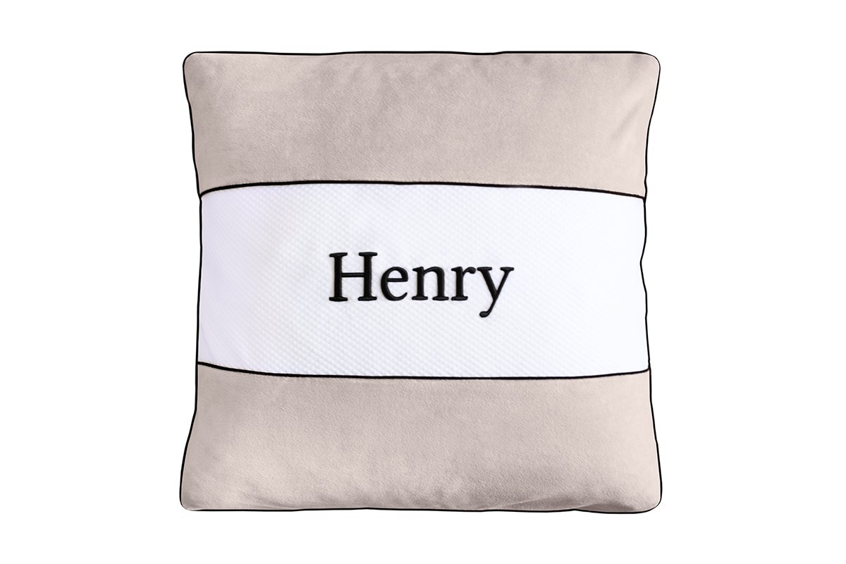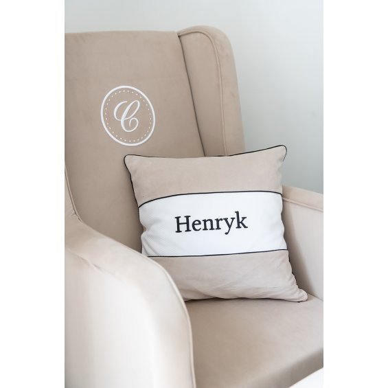 Urocza poduszka wykonana z pikowanego weluru w kolorze beżowym ozdobiona czarną kedrą oraz haftem z imieniem Twojego dziecka. To piękna dekoracja, która nada wnętrzu charakteru.