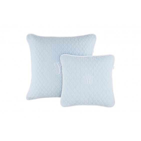 Ekskluzywne połączenie pikowanego błękitnego weluru z dekoracyjnym emblematem. Szlachetna i miła w dotyku tkanina wykończona lamówką.