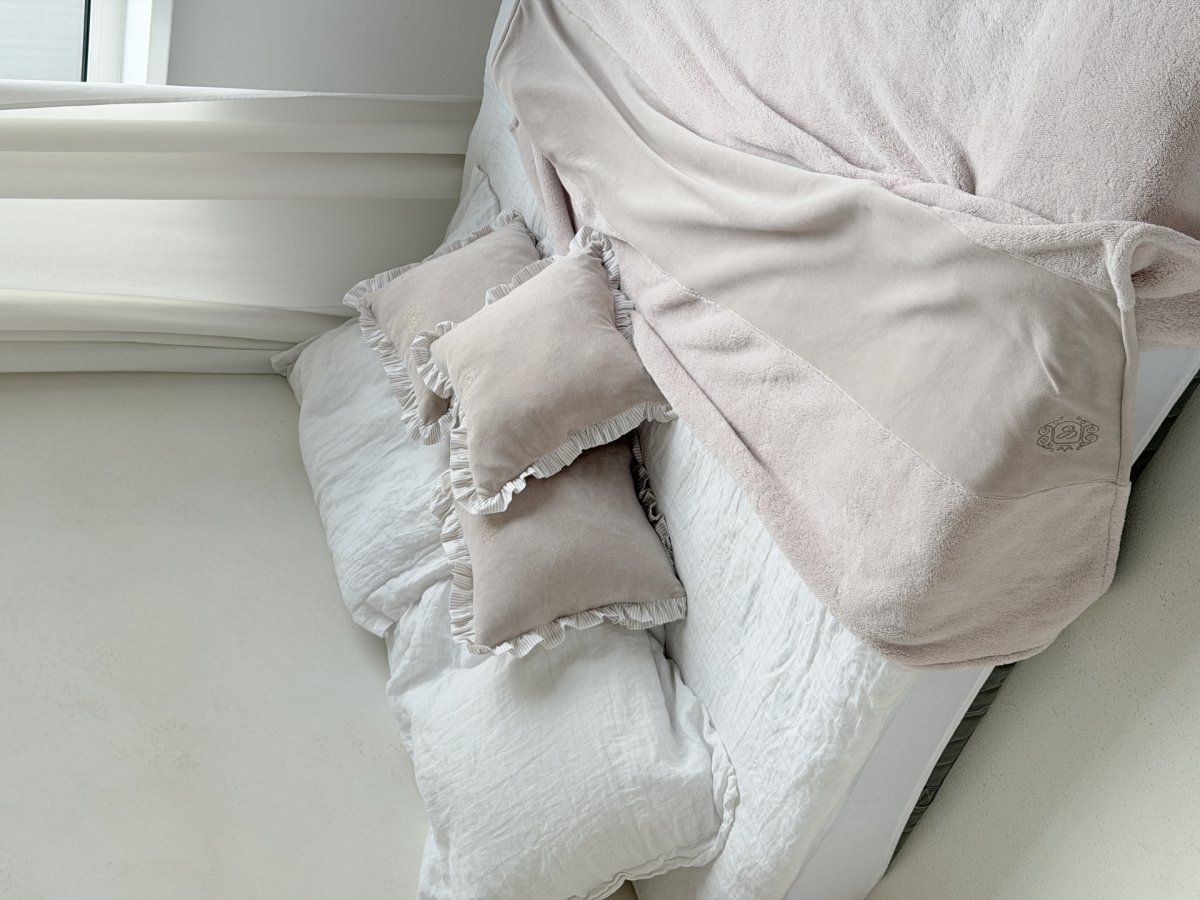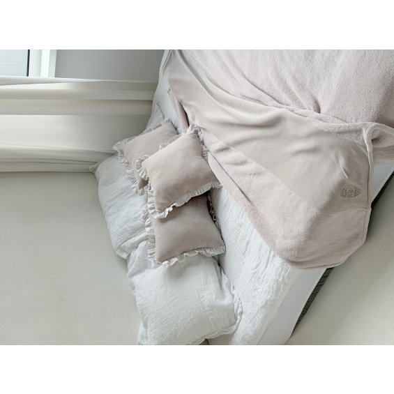Urocza poduszka wykonana z mięciutkiego weluru w kolorze beżowym. Ozdobiona została dekoracyjnym złotym emblematem. To piękna dekoracja, która nada wnętrzu charakteru.