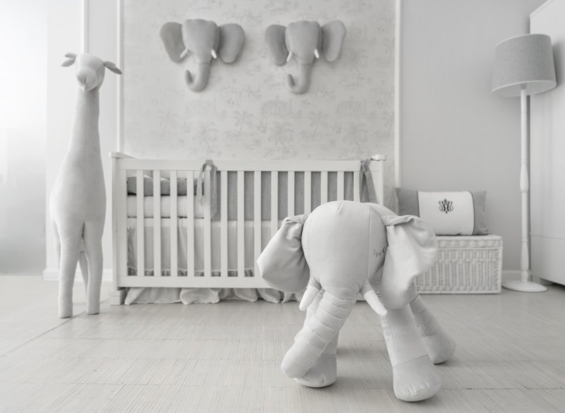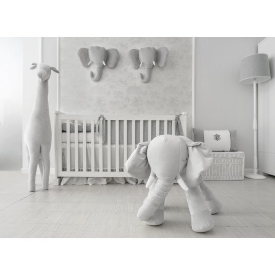Wykonany ręcznie z łatwo zmywalnej tkaniny słoń dekoracyjny w rozmiarze XL. Stanie się ulubionym towarzyszem dziecięcych zabaw, a także piękną dekoracją pokoju.