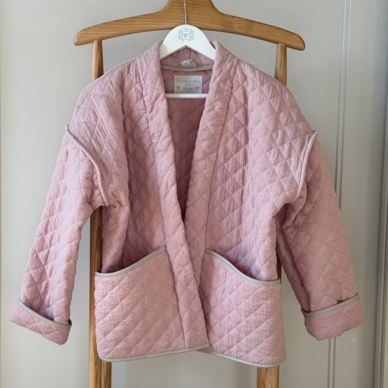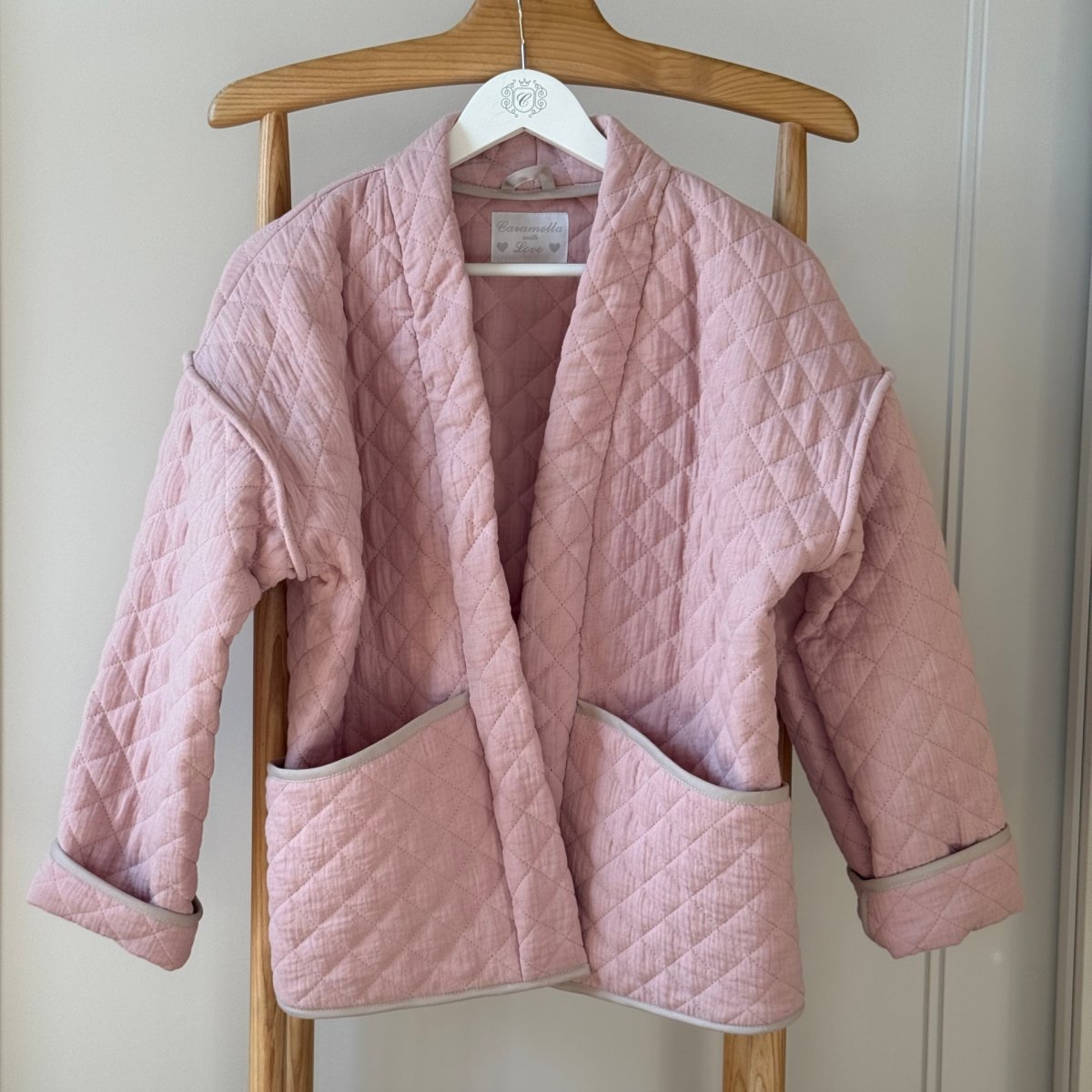 Pudrowe kimono uszyte z pikowanego muślinu wykończone beżową lamówką.