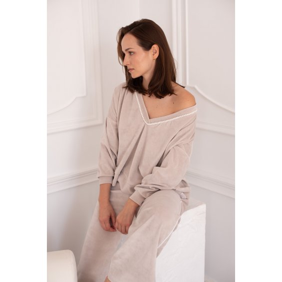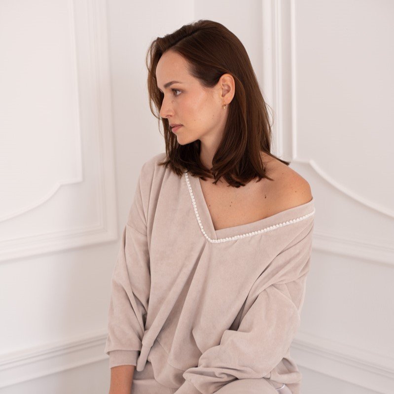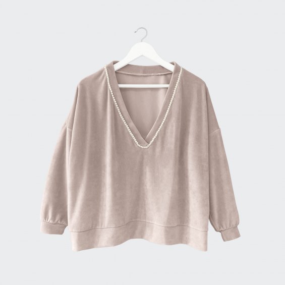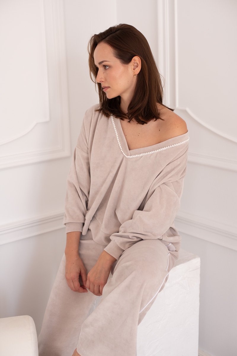 Welurowa beżowa bluza z perełkami przy dekolcie