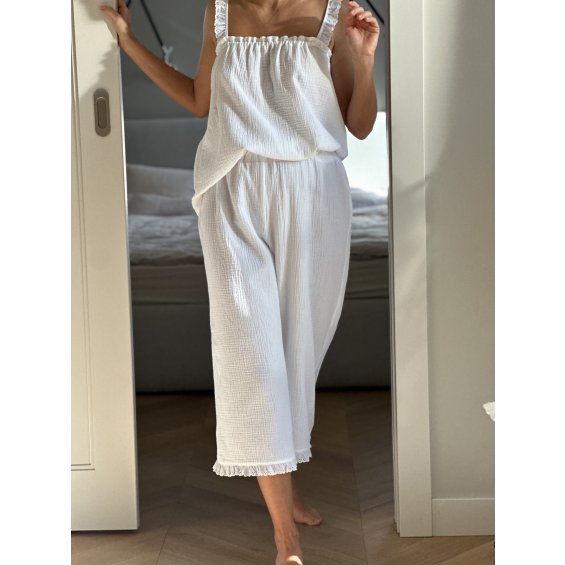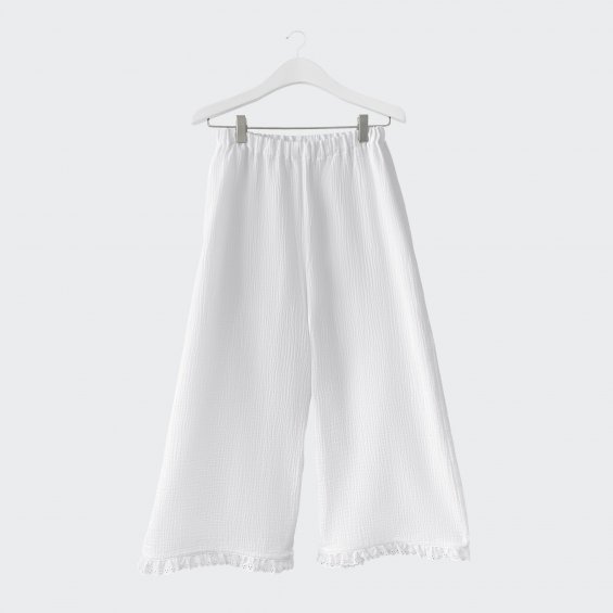 Białe luźne spodnie uszyte z przewiewnego muślinu wykończone dekoracyjną koronką z haftem richelieu.