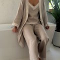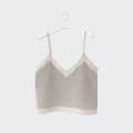 Beżowy top na ramiączkach uszyty z przewiewnego muślinu wykończony dekoracyjnymi mankietami.