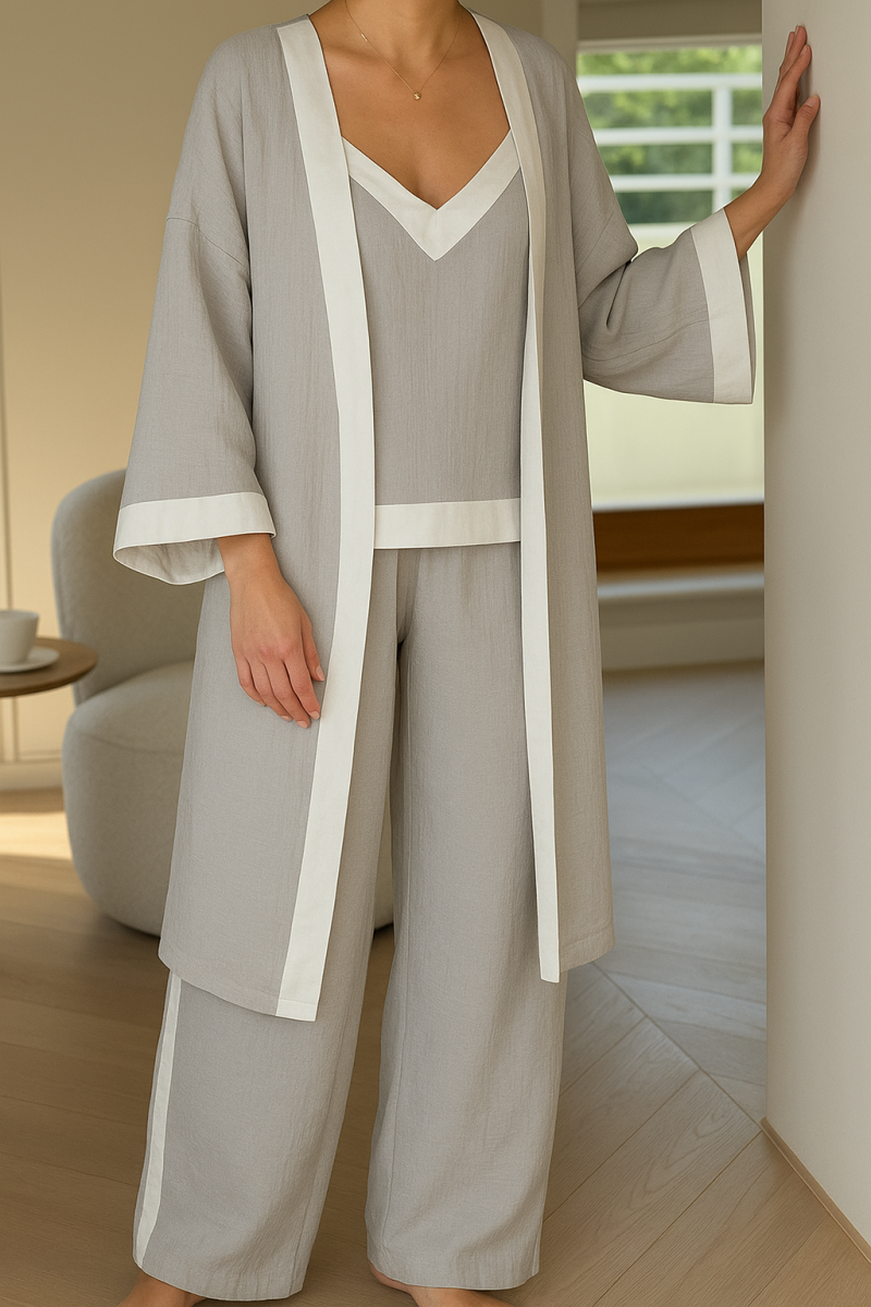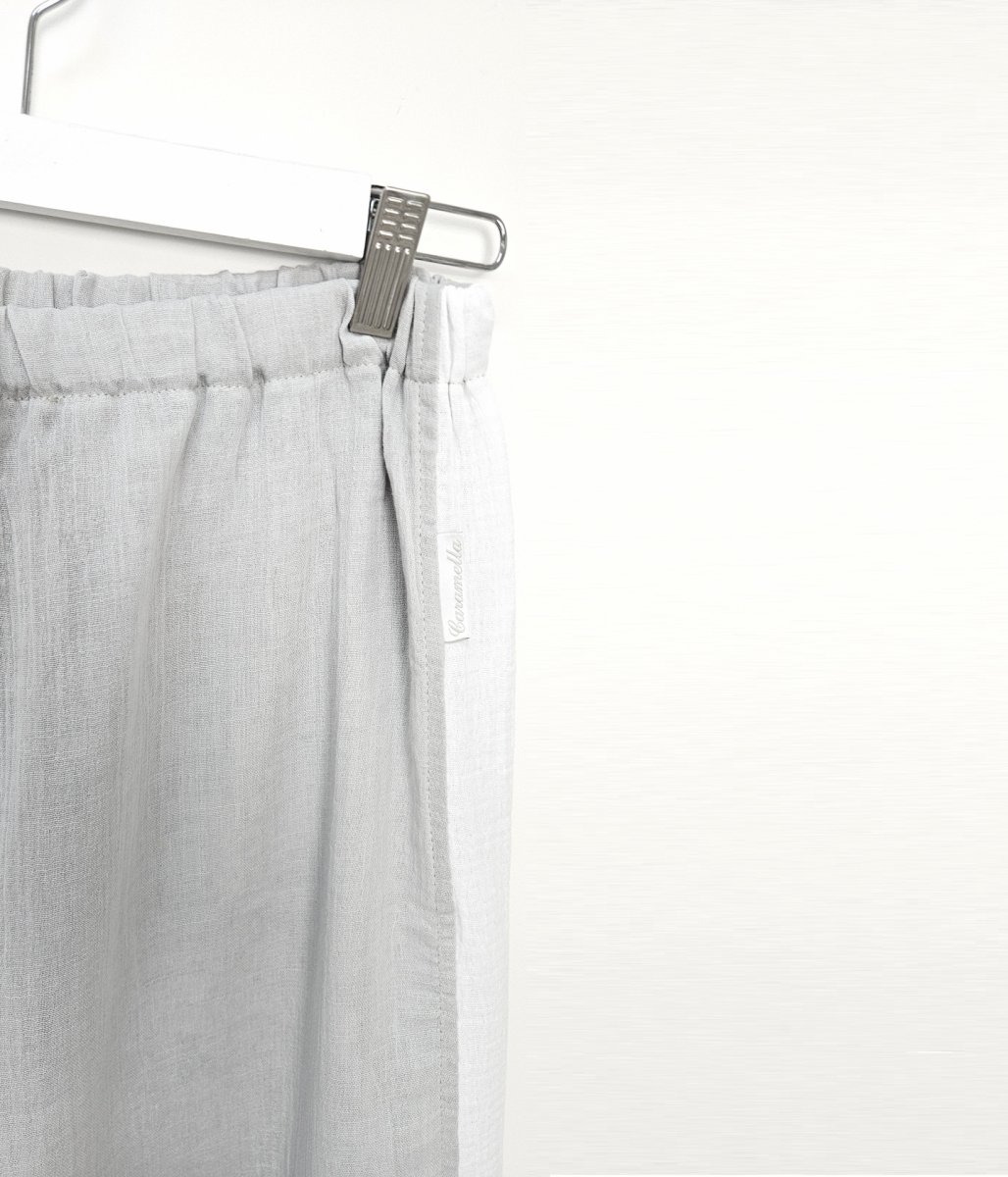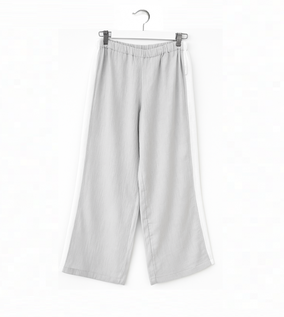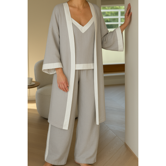 Muślinowe spodnie szare z lampasem, miękkie i przewiewne, idealne do spania lub na domowy relaks. Elegancki lampas dodaje klasy, łącząc wygodę z subtelnym stylem.