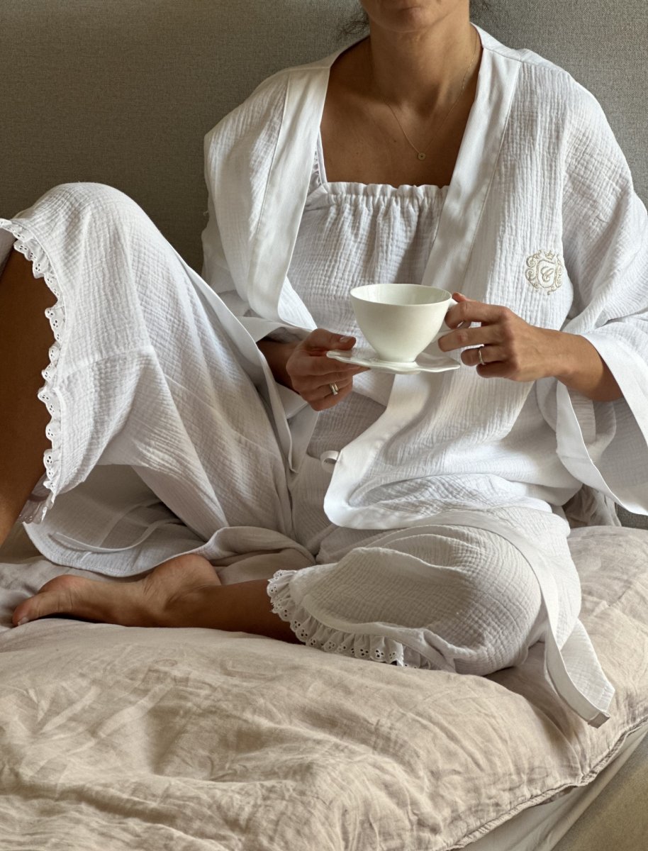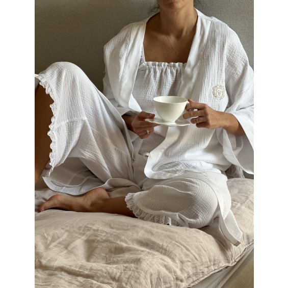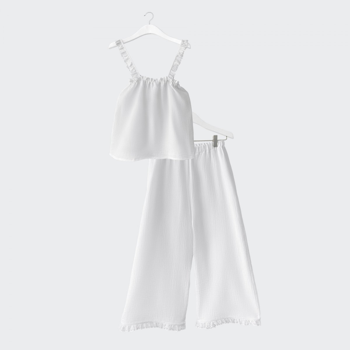 Biały zestaw muślinowy wykończony dekoracyjną koronką z haftem richelieu - top na ramiączkach oraz spodnie culotte.