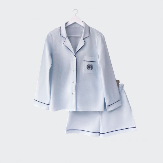 Elegancka piżama uszyta z bawełny w biało-błękitną krateczkę, wykończona granatową kedrą i ozdobiona haftowanym emblematem.