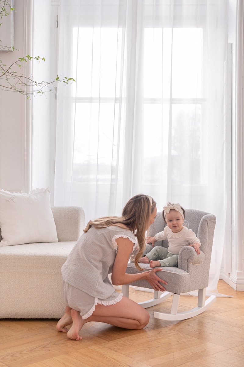 Szara piżamka z przewiewnego muślinu wykończona dekoracyjną białą koronką z haftem richelieu
