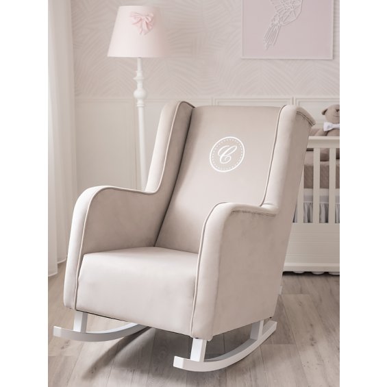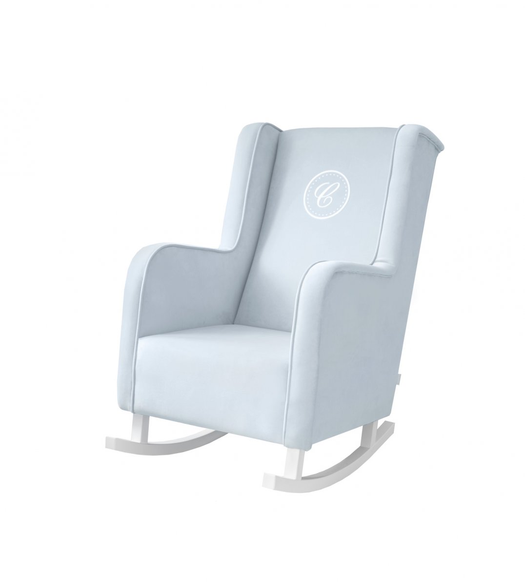 Duży, bardzo wygodny fotel bujany w stylu nowoczesnym, pokryty wysokiej jakości tkaniną zmywalną w kolorze błękitnym. Fotel ozdobiony jest szykowną białą kedrą oraz ekskluzywnym emblematem z literką "C". Ze względu na wysokie oparcie, "uszy" pod głowę oraz podłokietniki doceni go każda mama karmiąca. Fotel idealnie wpasuje do wnętrza - pokoju dziecięcego, salonu, sypialni i nie tylko.
