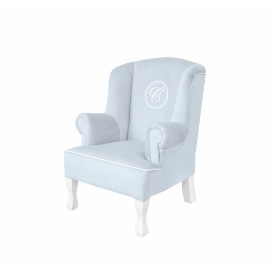 Elegancki, stylizowany fotelik w wersji mini. Pokryty wysokiej jakości tkaniną zmywalną w kolorze błękitnym i ozdobiony dekoracyjnym eleganckim emblematem z literką "C". Piękna, klasyczna forma w wersji mini, wzbogaci pokój każdego dziecka. Istnieje możliwość zamówienia fotelika w wielu kolorach przedstawionych na zdjęciu obok.