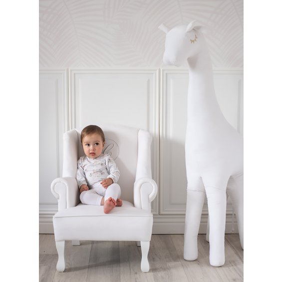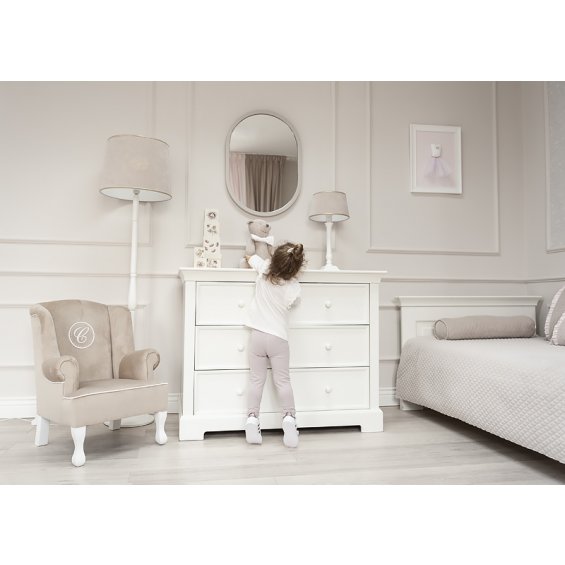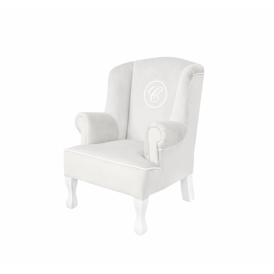Elegancki, stylizowany fotelik w wersji mini. Pokryty wysokiej jakości tkaniną zmywalną w kolorze kości słoniowej i ozdobiony dekoracyjnym eleganckim emblematem z literką "C". Piękna, klasyczna forma w wersji mini, wzbogaci pokój każdego dziecka.