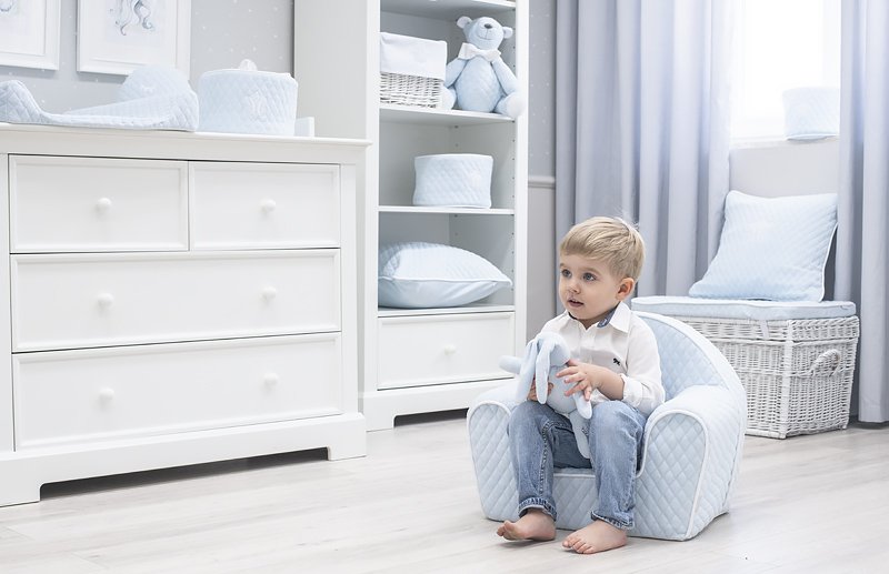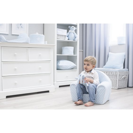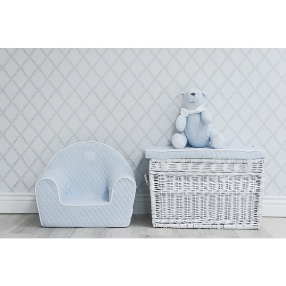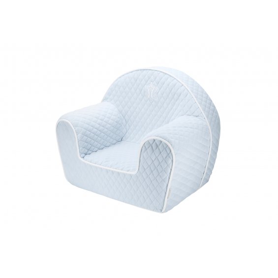 Malutki fotelik piankowy dla najmłodszych dzieci w kolorze błękitnym. Obszyty pikowanym welurem, ozdobiony białą kedrą i firmowym emblematem. Świetnie sprawdzi się jako pierwszy fotelik i będzie pięknym uzupełnieniem pokoju. Pokrowiec jest zdejmowany do prania.