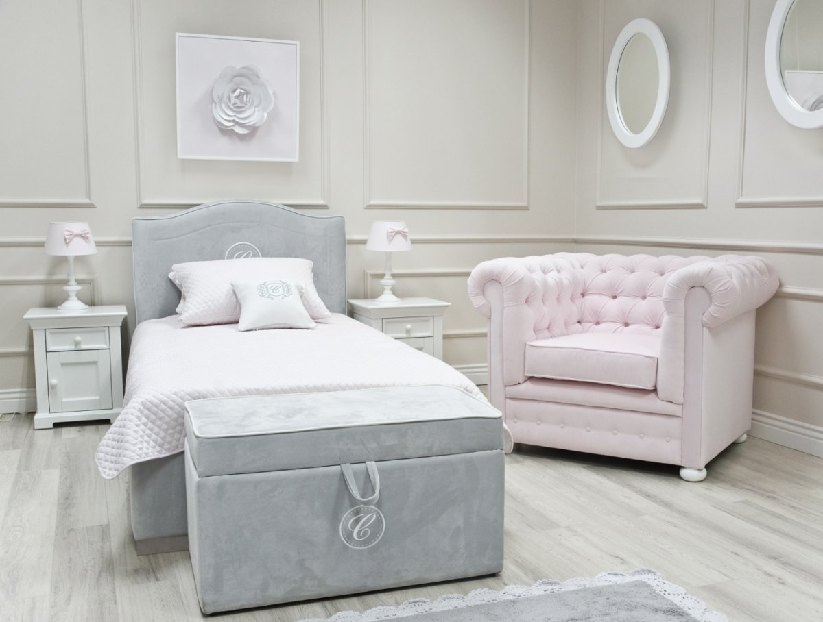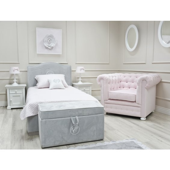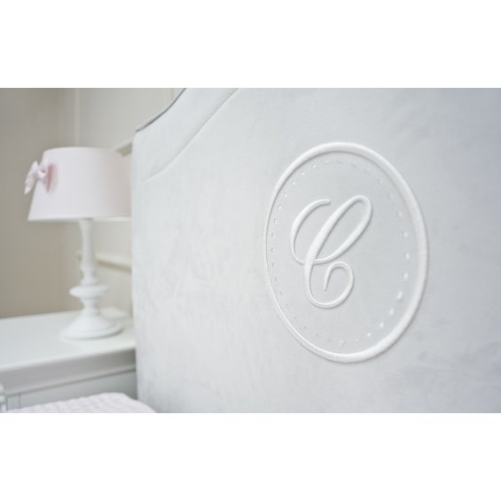 Eleganckie łóżko dziecięce z ekskluzywnym haftem z literką "C". Wezgłowie oraz zewnętrza część ramy łóżka są pokryte wysokiej jakości tkaniną zmywalną w kolorze szarym, przez co mebel jest odporny na wszelkie zabrudzenia. Wezgłowie łóżka wykończone jest dekoracyjną falką oraz kedrą w kolorze białym. Piękny i funkcjonalny mebel, który nada charakteru każdemu wnętrzu. Istnieje możliwość zamówienia łóżka z pojemnikiem na pościel i w różnych rozmiarach.