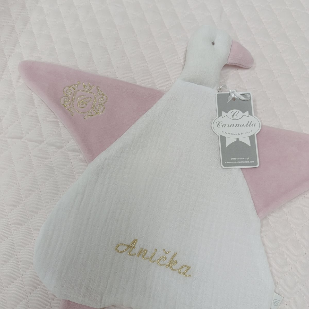 Urocza gąska do spania - pierwsza przytulanka maluszka, która pomoże mu zasnąć. Dou dou "nasączone" zapachem mamy daje niemowlęciu poczucie bezpieczeństwa i bliskości. Możliwość personalizacji poprzez wyhaftowanie imienia na brzuszku przytulanki.