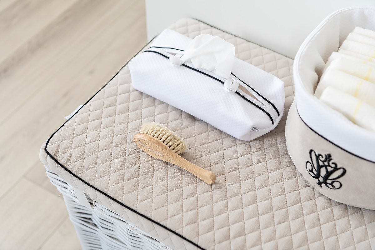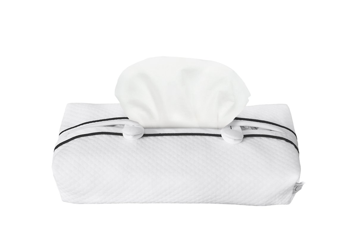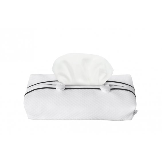Piękne i funkcjonalne etui na mokre chusteczki do pielęgnacji dziecka. Wykonane zostało z białej goferkowej bawełny i ozdobione czarną kedrą oraz dwoma guziczkami. Istnieje możliwość dokupienia pasującej kosmetyczki z tej samej kolekcji.