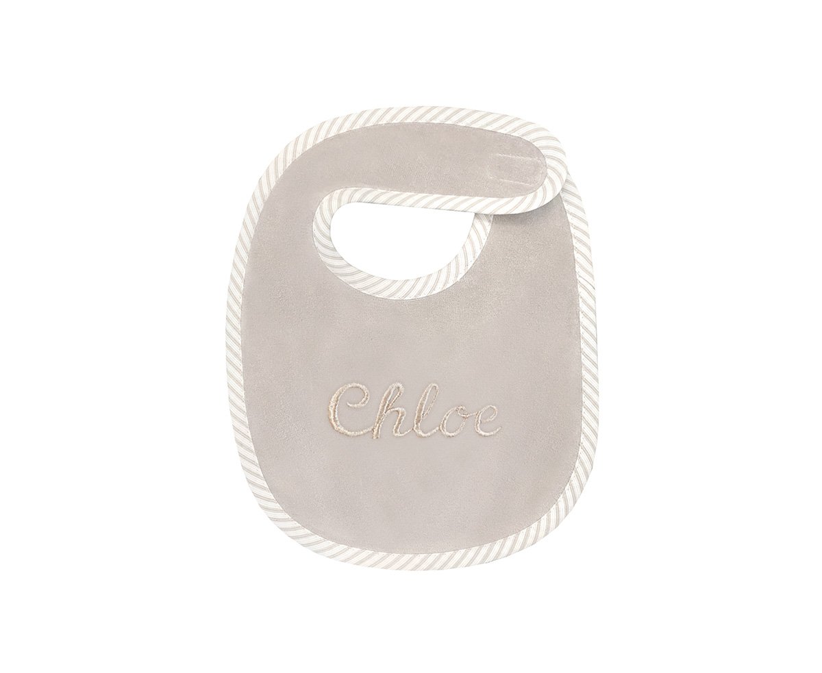 Praktyczny śliniaczek wykonany z milutkiego beżowego weluru, przyjemnego dla każdego malucha. Zapinany bezpiecznie na rzep i ozdobiony złotym haftem z imieniem Twojego dziecka.