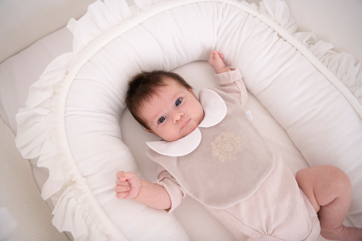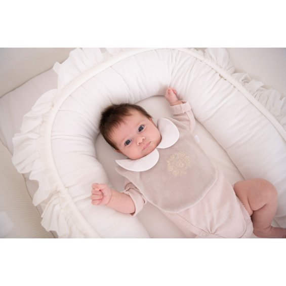 Stylowy śliniaczek wykonany z milutkiego beżowego weluru, przyjemnego dla każdego malucha. Zapinany bezpiecznie na rzep, ozdobiony kołnierzykiem bebe i złotym emblematem.