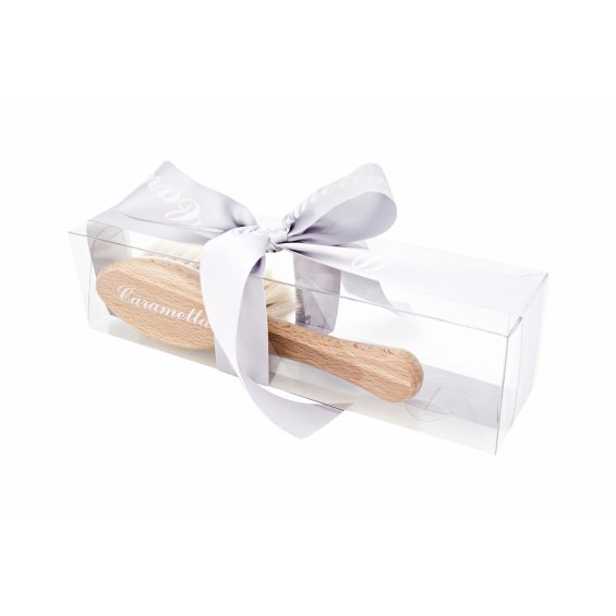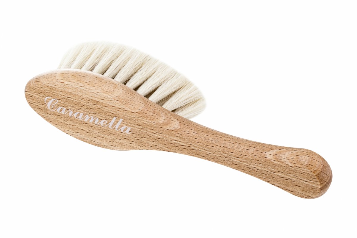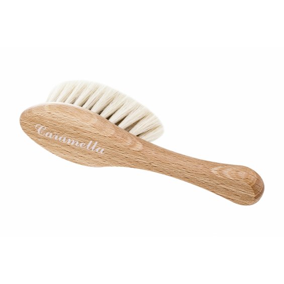 Szczoteczka dla dzieci i niemowląt, wykonana z delikatnego dla skóry głowy włosia z naturalnej koziny. Doskonale masuje główkę malucha, pomagając rozczesywać pierwsze włoski. Szczotka posiada lekką drewnianą rączkę z białym napisem "Caramella". Produkt zapakowany jest w przezroczyste pudełeczko.