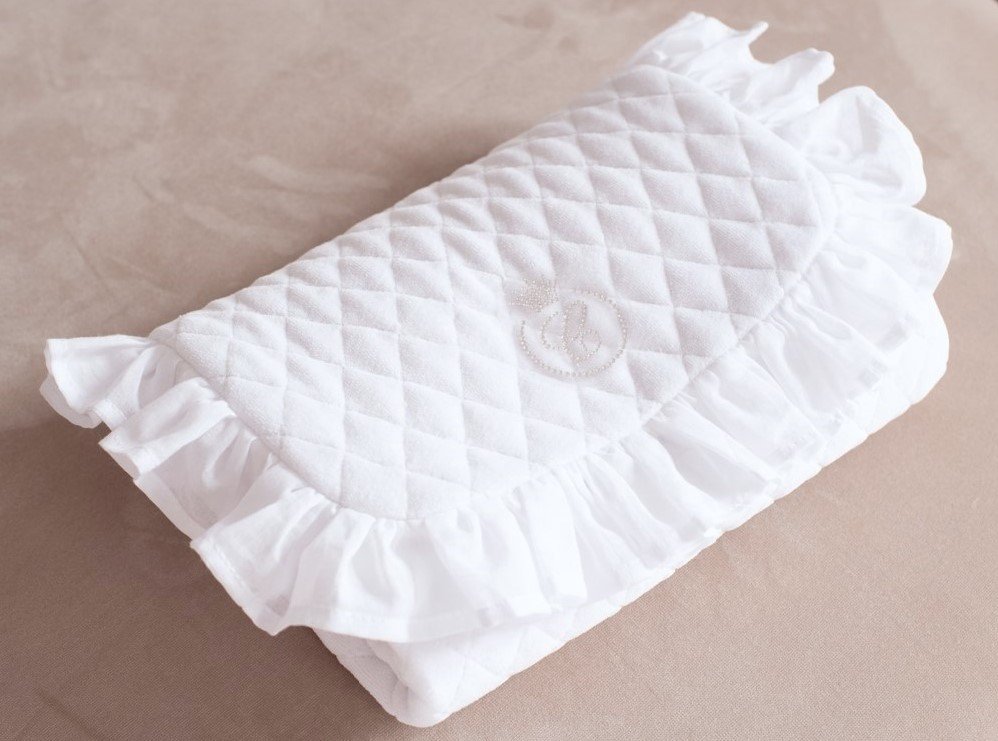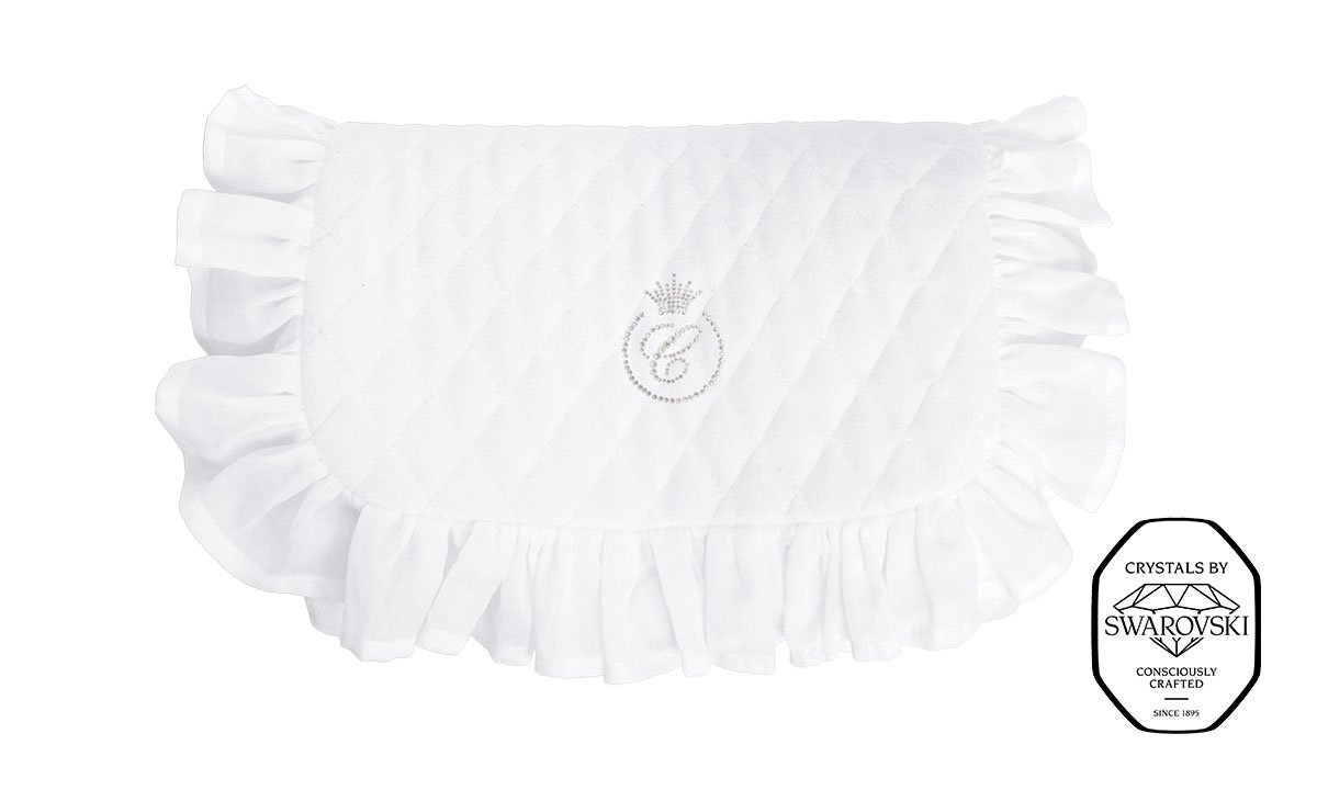 Luksusowa mata do przewijania dziecka ozdobiona kryształami Swarovski®. Wykonana z przyjemnego dla skóry dziecka weluru w kolorze białym. Udekorowana transparentną, zwiewną falbanką z eleganckim emblematem z oryginalnych kryształów Swarovski®. Wraz z kosmetyczką stanowi doskonałe uzupełnienie torby dla mamy.