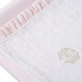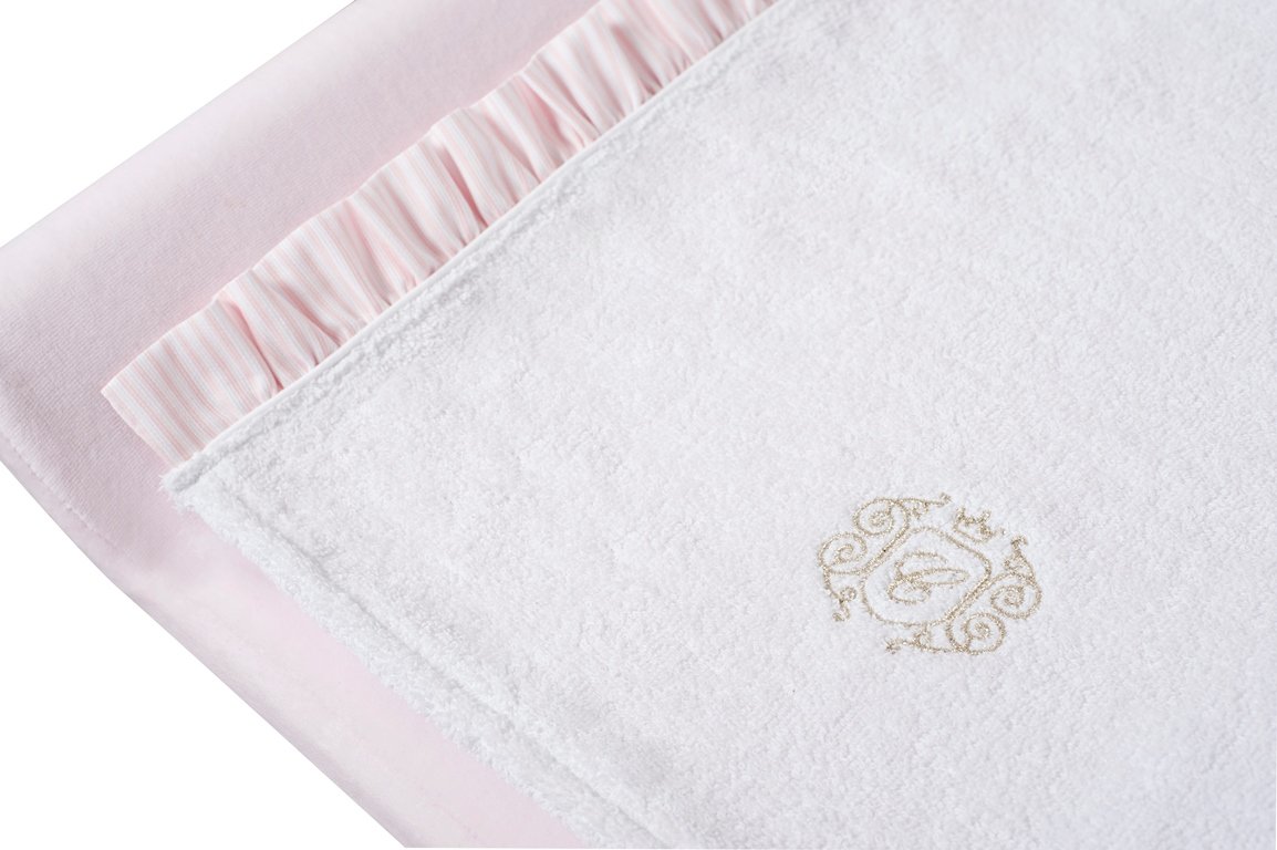 Nakładka na przewijak chroni go przed zmoczeniem. Wykonana z tkaniny frotte, ozdobiona stylowym firmowym emblematem oraz falbanką