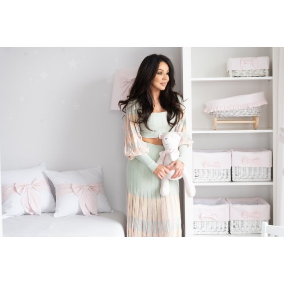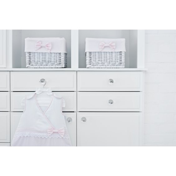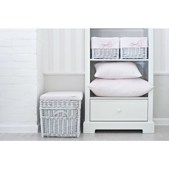 Kosze wiklinowe z pudrowym obszyciem z uroczymi kokardkami. Wnętrze z solidnej, białej tkaniny drelichowej sprawdzi się nawet przy najcięższych zabawkach. Kosze wykonane są z polskiej, ręcznie plecionej wikliny, lakierowanej na biało.
