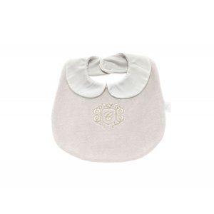 Praktyczny pojemnik na pieluchy wykonany z beżowego pikowanego weluru i ozdobiony falbanką. Jego kształt jest dopasowany do kształtu i rozmiaru pieluch.