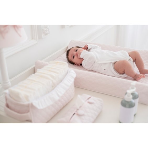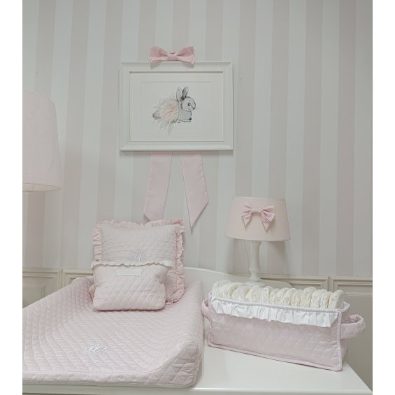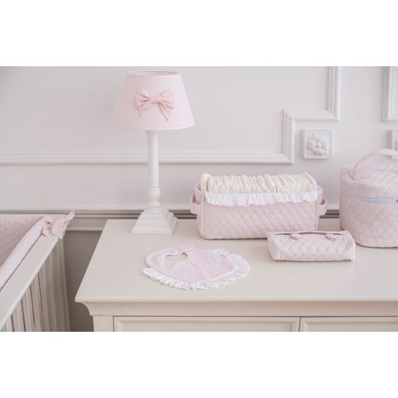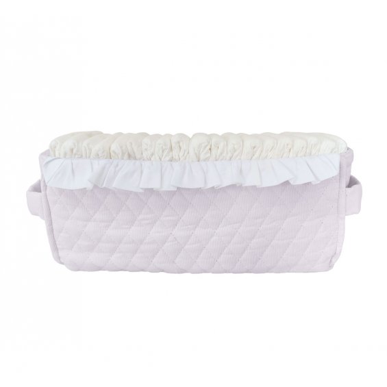 Praktyczny pojemnik na pieluchy wykonany z pikowanej bawełny w odcieniu pudrowego różu i ozdobiony uroczą falbanką. Jego kształt jest dopasowany do kształtu i rozmiaru pieluch.