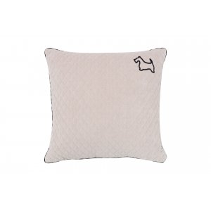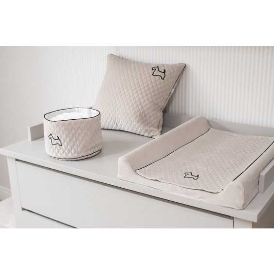 Okrągły pojemnik wykonany z beżowego pikowanego weluru. Ozdobiony czarną kedrą oraz haftem. Będzie doskonałym miejscem do przechowywania zabawek lub dziecięcych akcesoriów.
