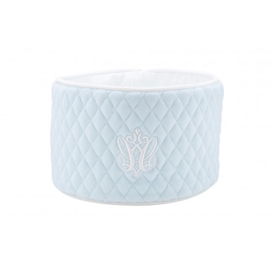 Okrągły pojemnik wykonany z błękitnego pikowanego weluru i ozdobiony eleganckim haftem. Będzie doskonałym miejscem do przechowywania zabawek lub dziecięcych akcesoriów.