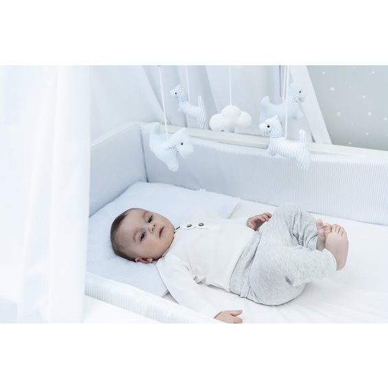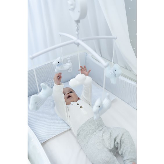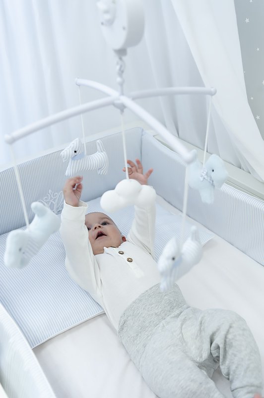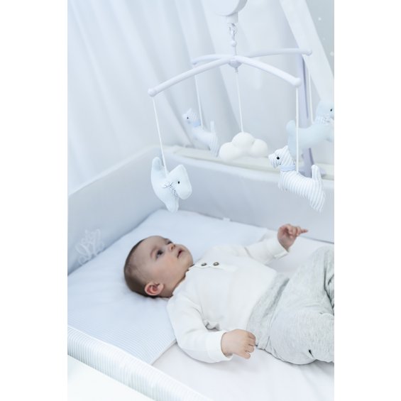 Pałąk od karuzeli składa się z kilku części, które należy połączyć ze sobą. Mechanizm z pozytywką należy zawiesić u góry mocowania. Pozytywka gra relaksującą melodię. Karuzela jest montowana do boku łóżeczka.