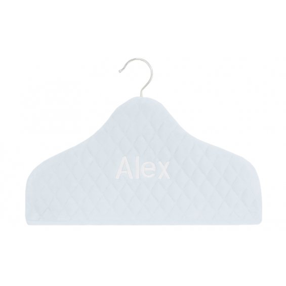 Elegancki wieszaczek na ubranka dziecięce wykonany z pikowanego błękitnego weluru. Ozdobiony haftem z imieniem Twojego dziecka. Pod obszyciem znajduje się drewniany wieszaczek z emblematem Caramella.