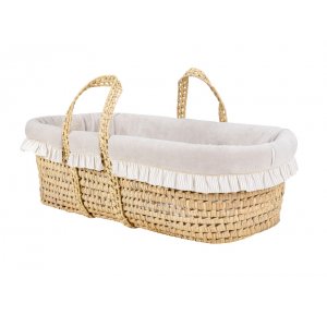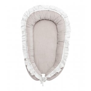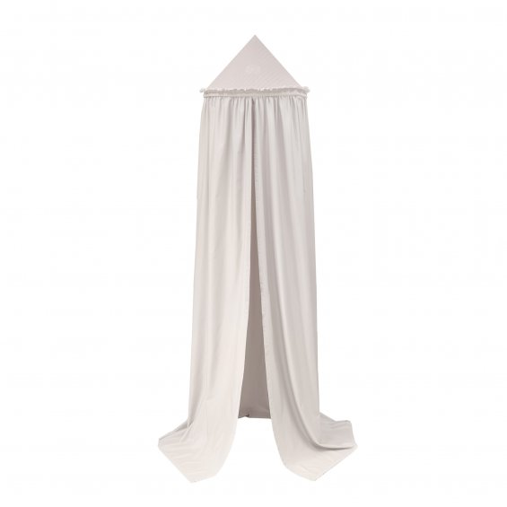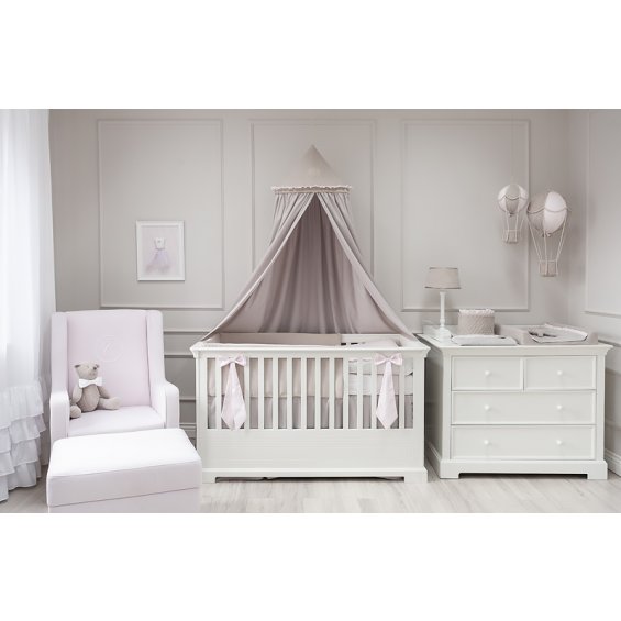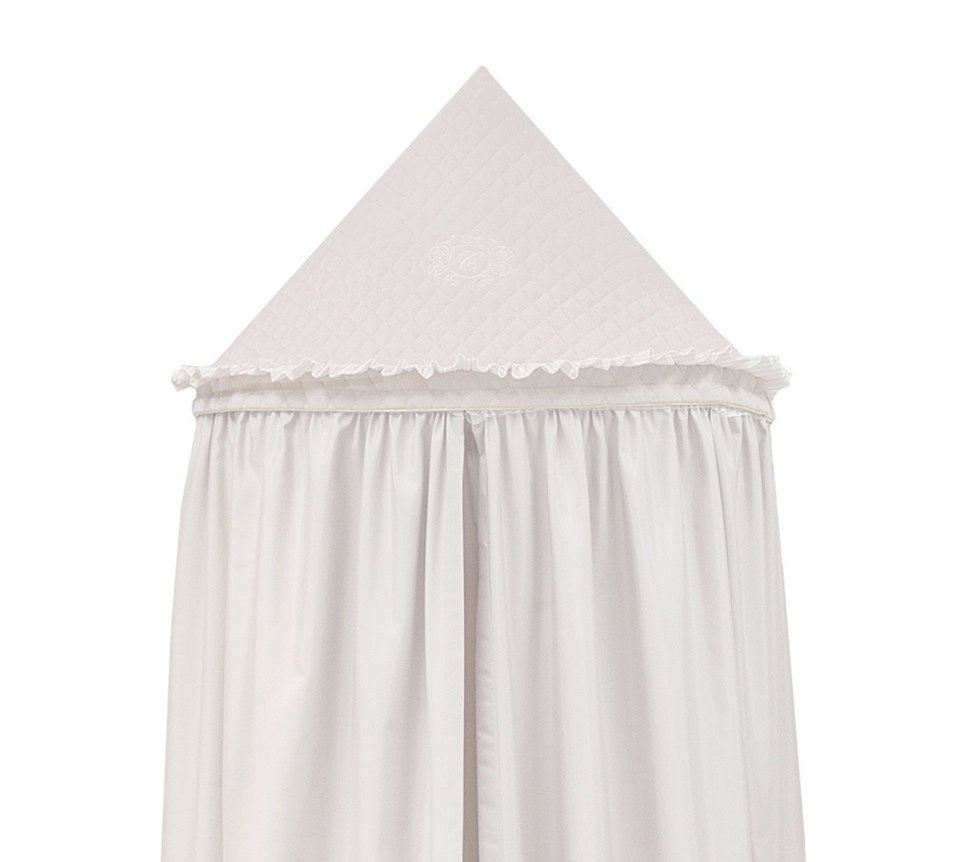 Zjawiskowy baldachim wiszący do pokoju dziecka. Wykonany z beżowej gładkiej tkaniny i pikowanego beżowego weluru, wykończony uroczą falbanką w biało beżowe paseczki i złotą kedrą. Baldachim jest podwieszany do sufitu, nadaje się zarówno do łóżeczka niemowlęcego, jak i dużego łóżka.