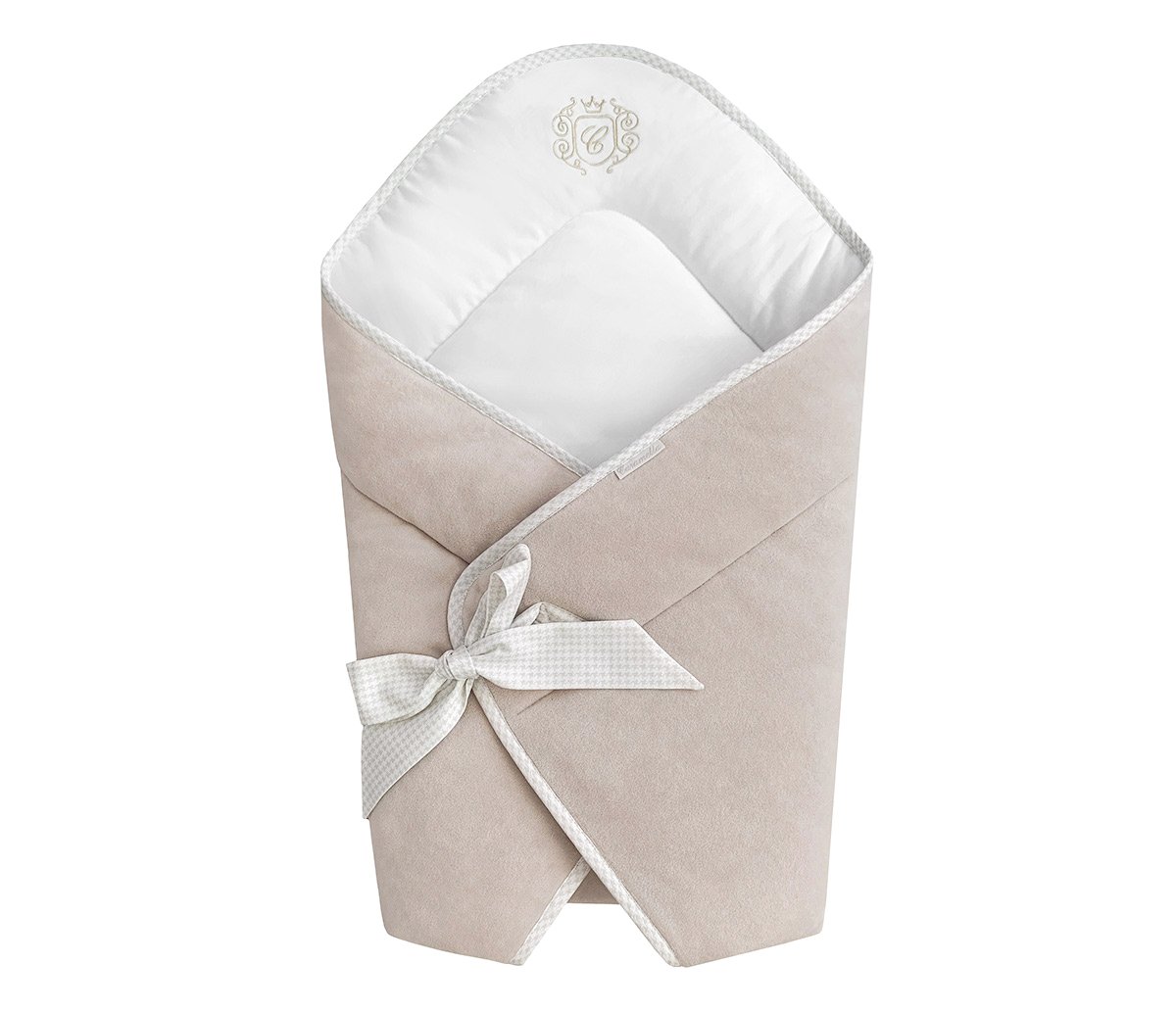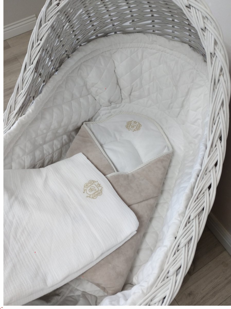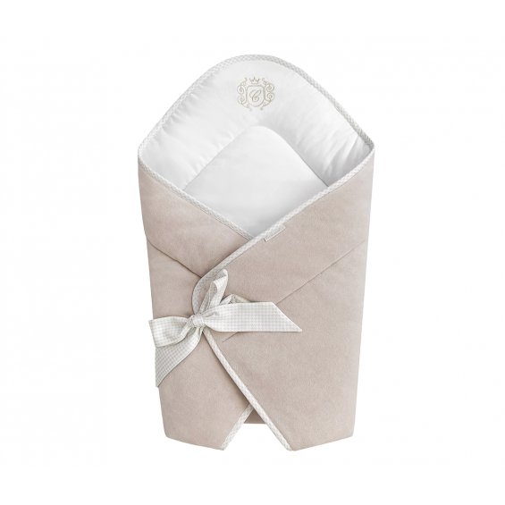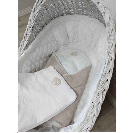 Elegancki becik w kolorze beżowym dla noworodka. Rożek wykonany jest z beżowego welurku oraz wypełniony włókniną, dzięki czemu jest bardzo cieplutki. Udekorowany złotym firmowym haftem. Becik jest bardzo wygodny w użytkowaniu - wiązany na kokardkę. Nie posiada usztywnienia, a po rozłożeniu doskonale sprawdzi się również jako letnia kołderka.