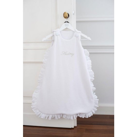 Luksusowy śpiworek wykonany z przyjemnego dla skóry dziecka weluru w kolorze białym. Jest ozdobiony transparentną falbanką i srebrnym haftem z imieniem Twojego dziecka. Bardzo wygodny w użytkowaniu - z boku znajduje się długi suwak. Idealny dla dzieci wiercących się i odkrywających podczas snu.