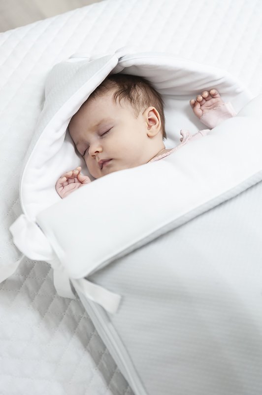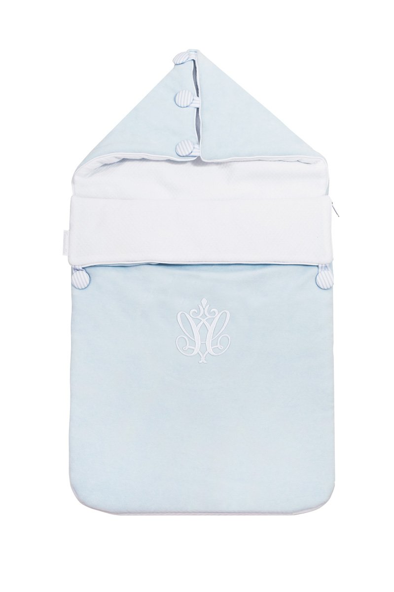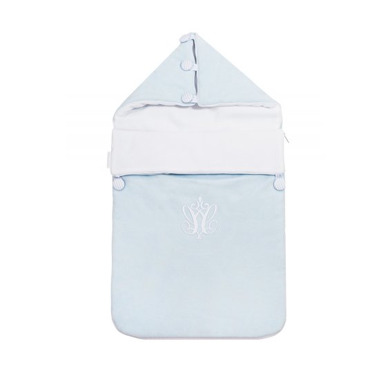 Uroczy śpiworek chłopięcy wykonany z weluru w kolorze błękitnym. Wnętrze śpiworka pokryte jest przyjemnym dla skóry dziecka materiałem "goferkiem" w kolorze białym. Śpiworek posiada kapturek, który po rozpięciu guziczków można rozłożyć tworząc tym samym kocyk lub matę. Tył śpiworka jest wyposażony w otwory umożliwiające przypięcie dziecka pasami w foteliku samochodowym.