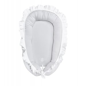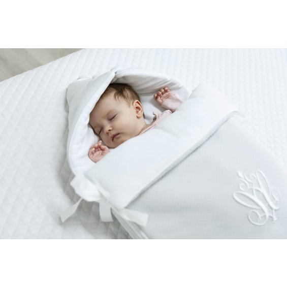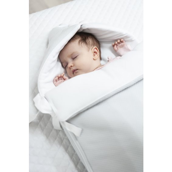 Uroczy jasnoszary śpiworek z kolekcji Pure Grey ozdobiony eleganckim emblematem i wiązaniem. Z jednej strony szara goferkowa bawełna, od środka biały welurek. Śpiworek posiada kapturek, który po rozpięciu guziczków można rozłożyć tworząc tym samym kocyk lub matę. Tył śpiworka jest wyposażony w otwory umożliwiające przypięcie dziecka pasami w foteliku samochodowym.