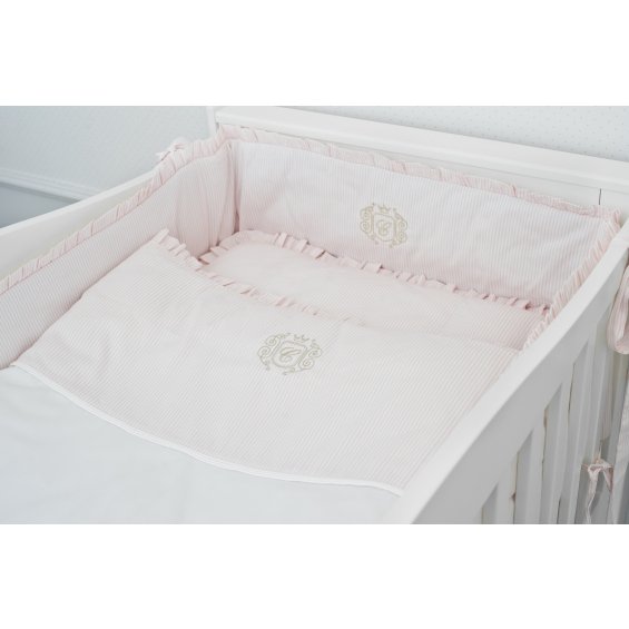 Dopełnienie luksusowej pościeli Golden Chic. Ochraniacz wykonany jest z wysokiej jakości tkaniny w biało-pudrowe paseczki oraz ozdobiony złotym eleganckim emblematem. Dzięki wypełnieniu ze specjalnej gąbki, ochraniacz jest sztywny i dobrze przylega do łóżeczka. Krótkie, szerokie troki pozwalają łatwo zamontować go do szczebelków. Pokrowiec zapinany jest na suwak, co pozwala łatwo go zdjąć, jak również wyjąć wewnętrzną gąbkę. Oba produkty nadają się do prania.